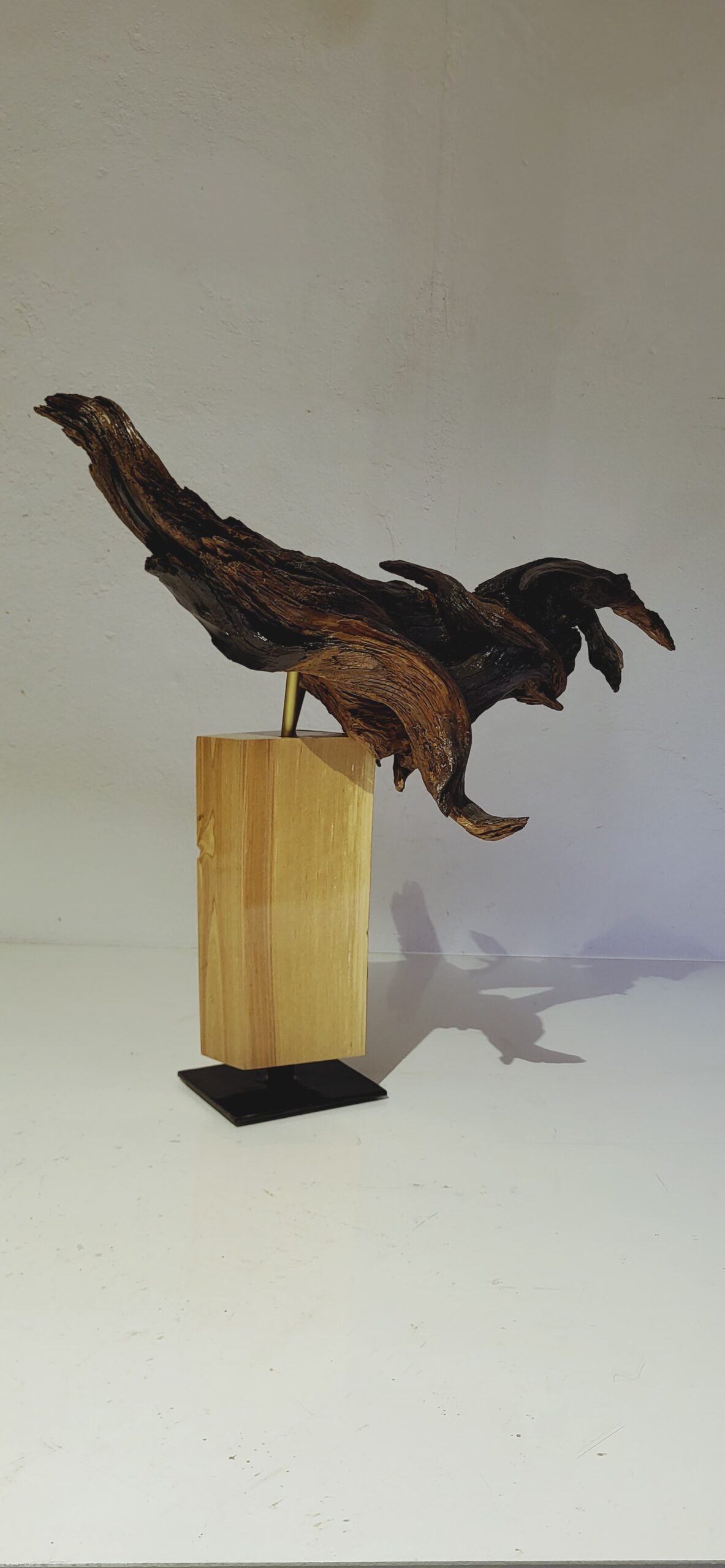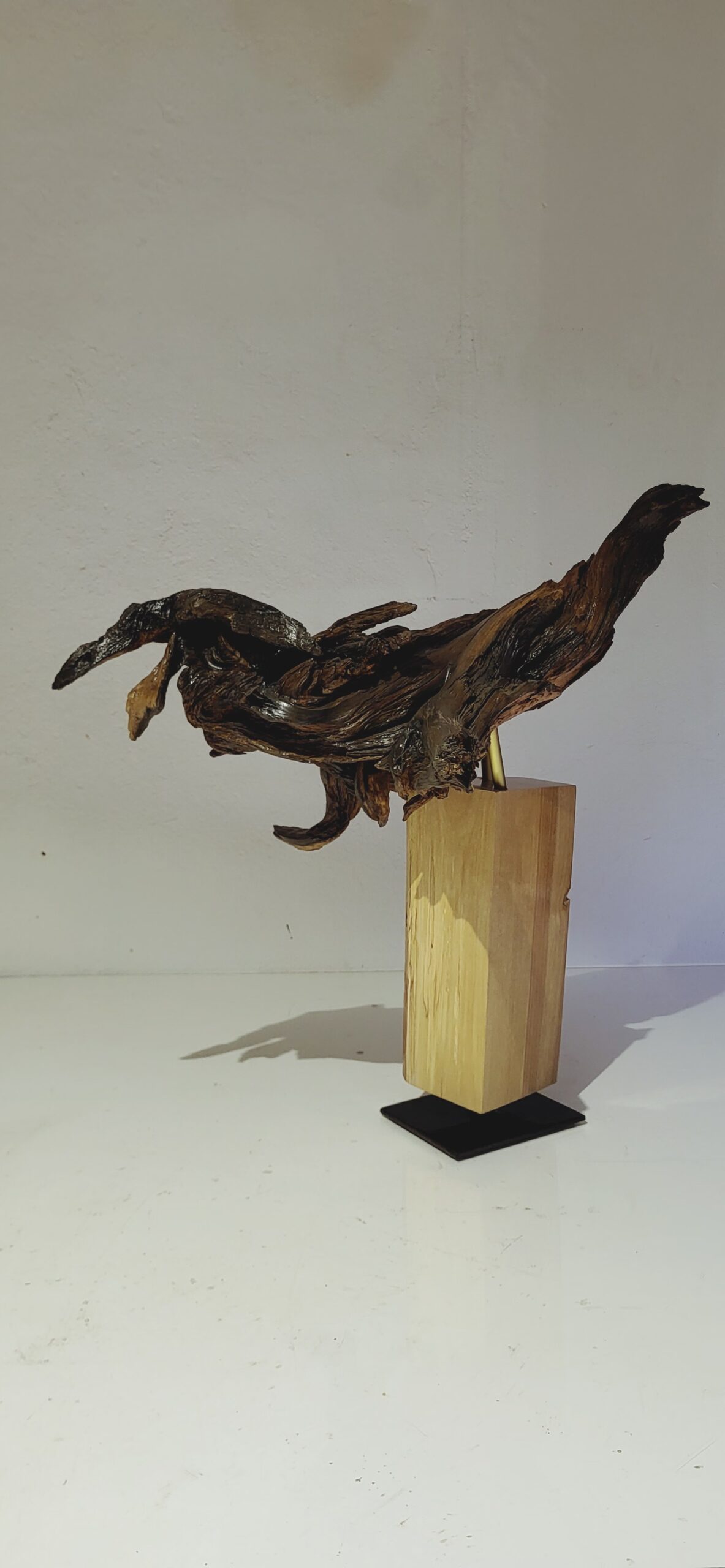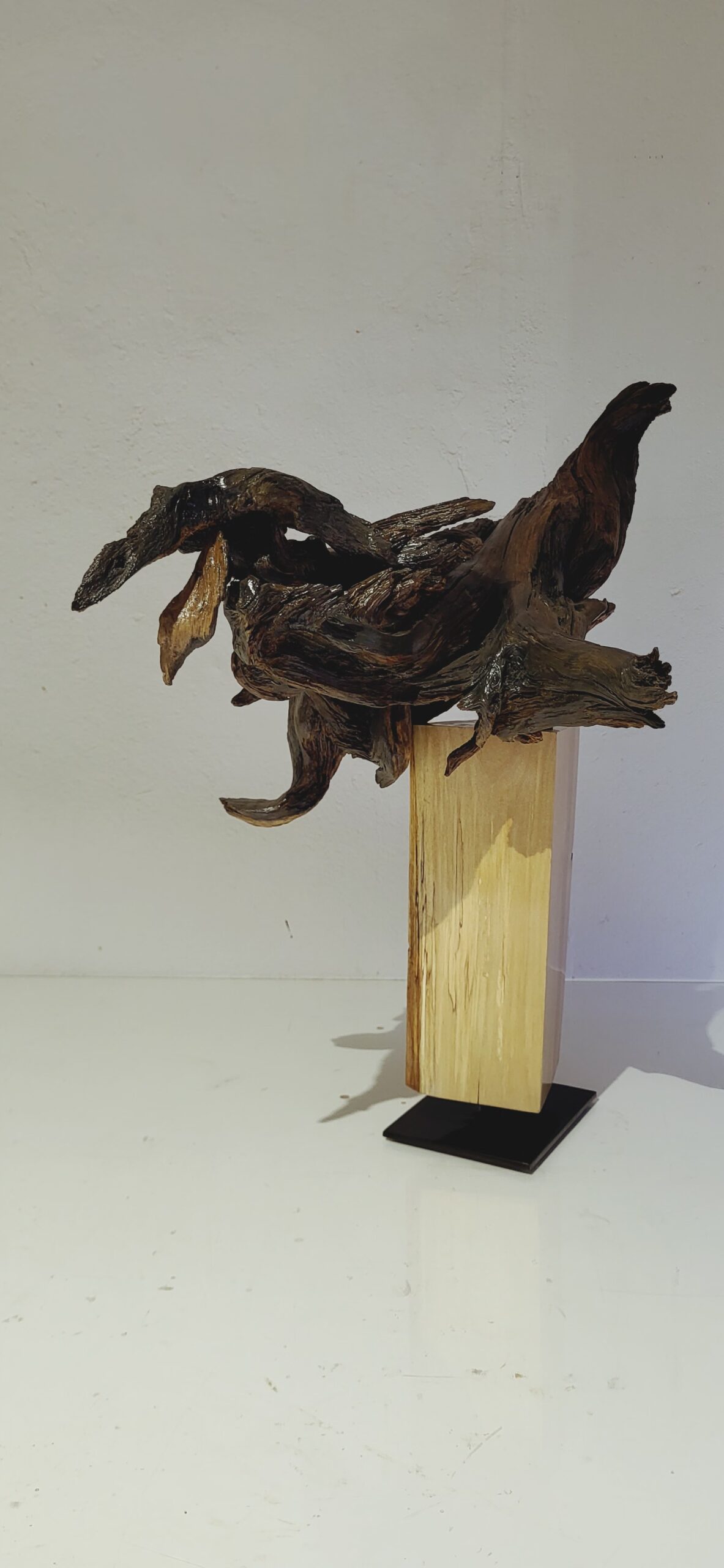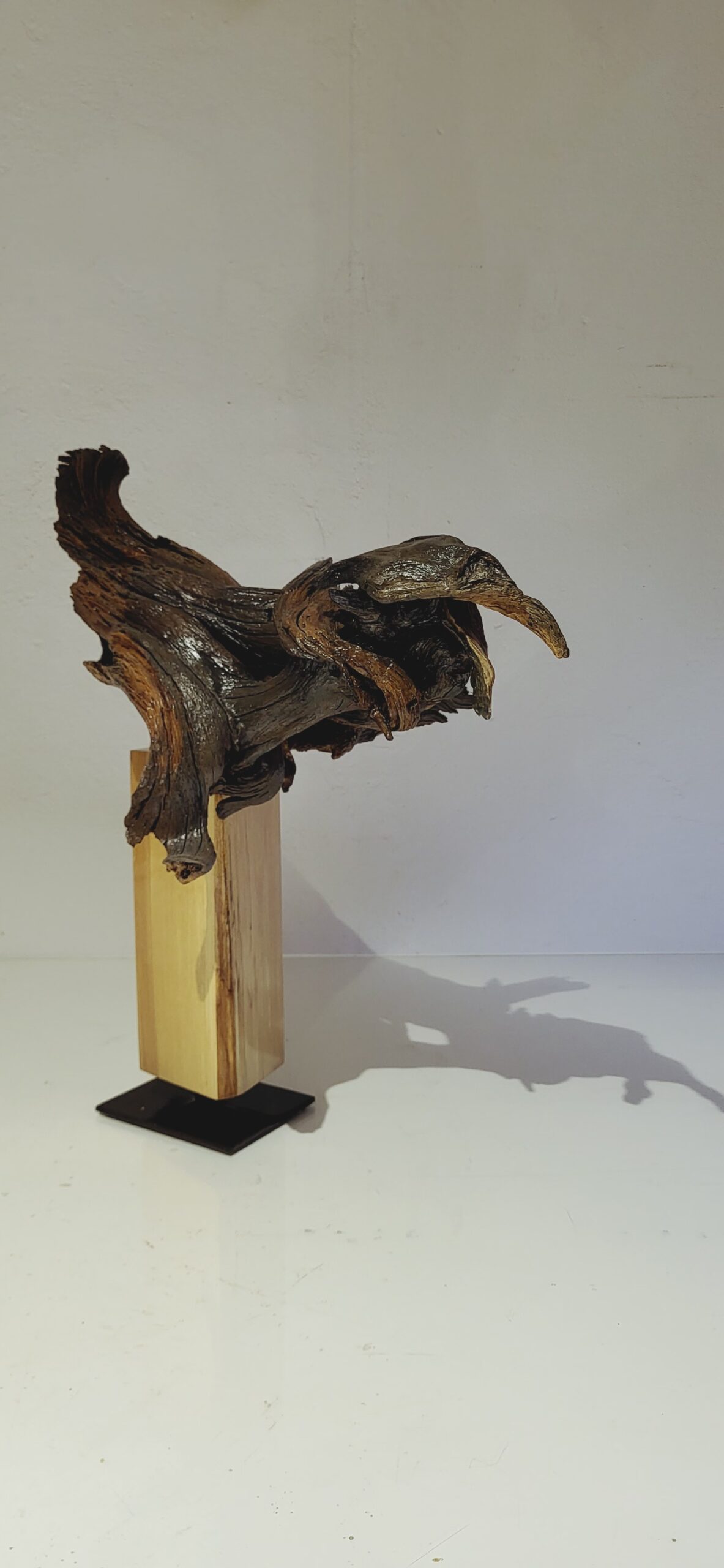 Skulptūrai panaudota nulakuota pušies šaknis. Postamentas padarytas iš lakuoto ir