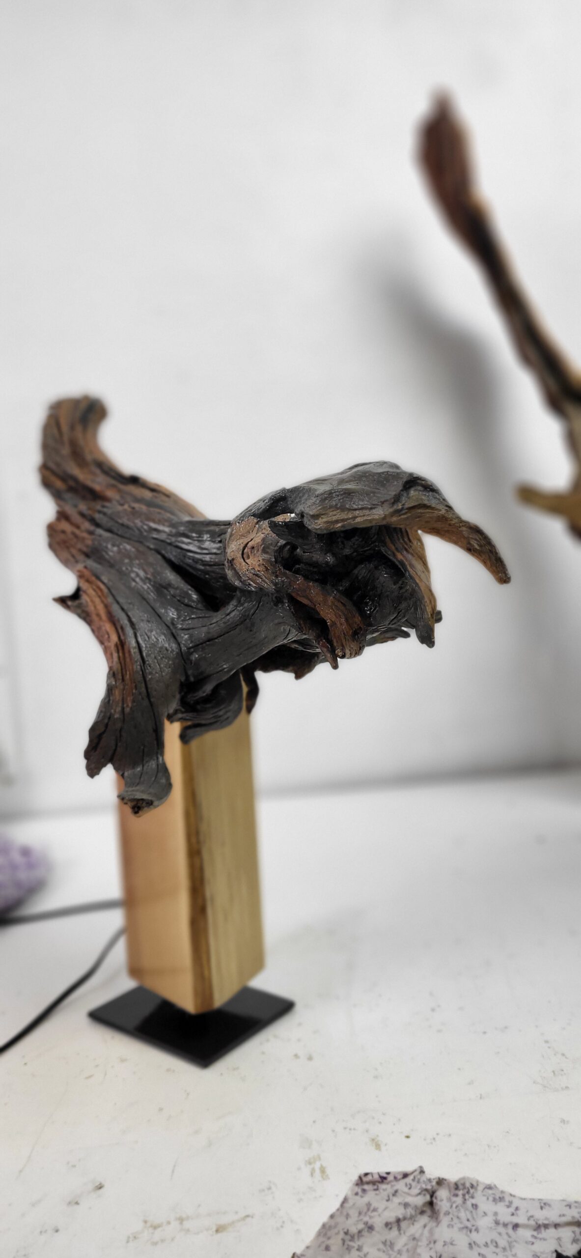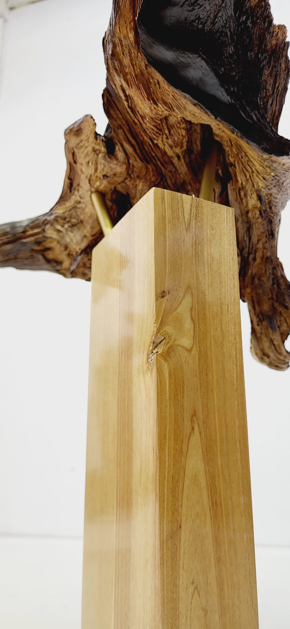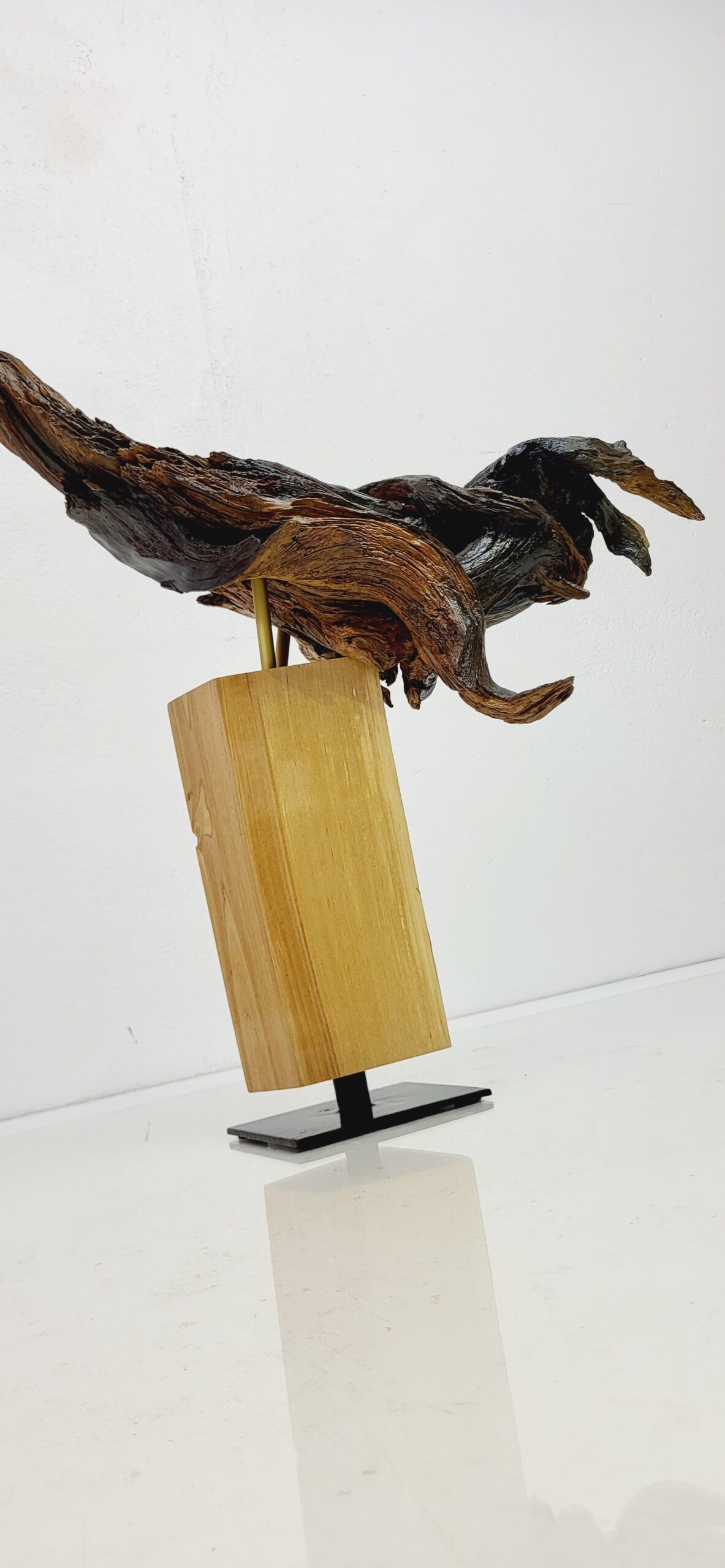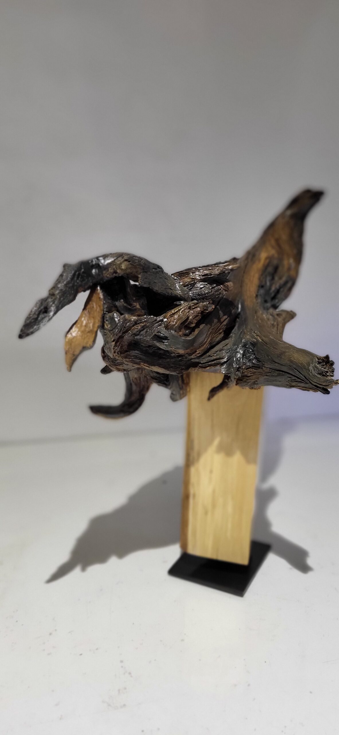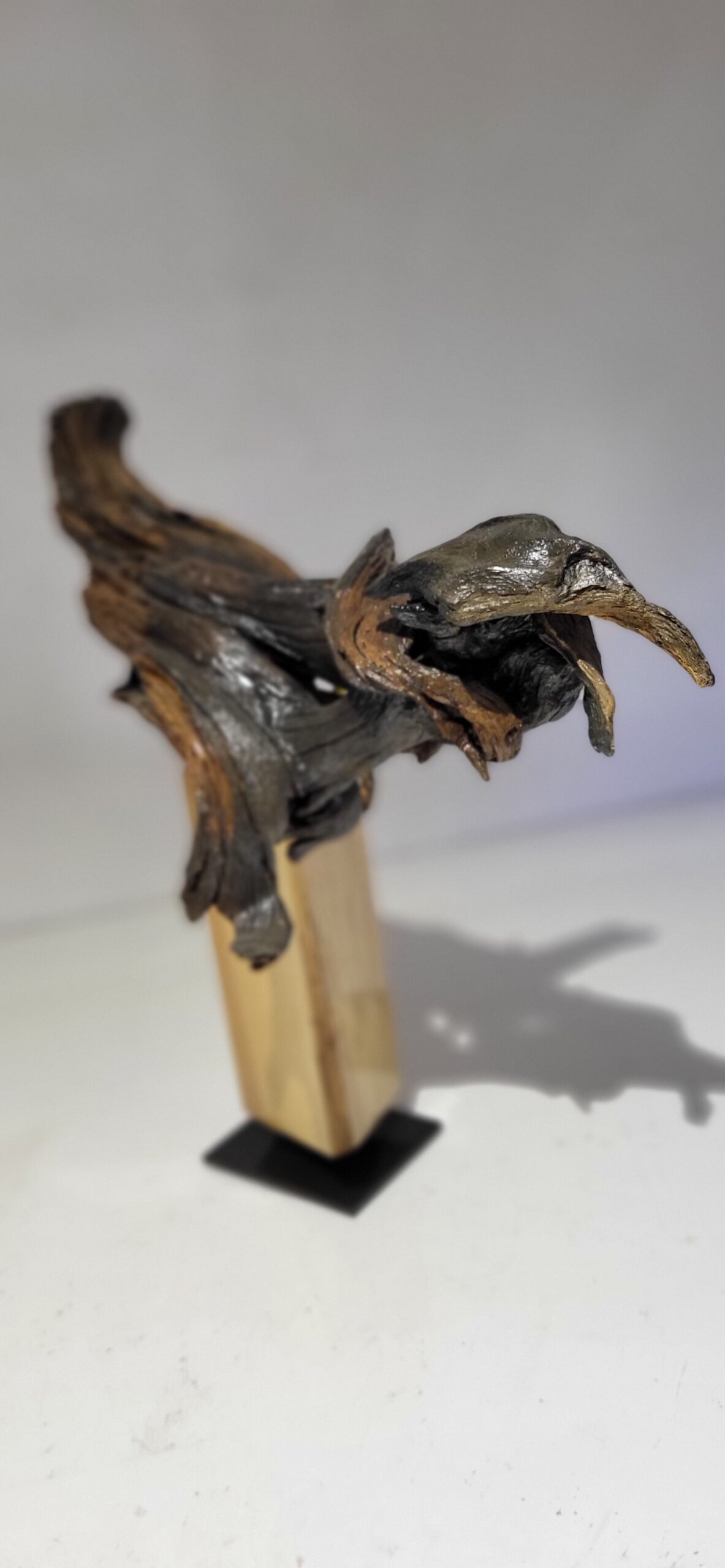 Skulptūrai panaudota nulakuota pušies šaknis. Postamentas padarytas iš lakuoto ir