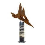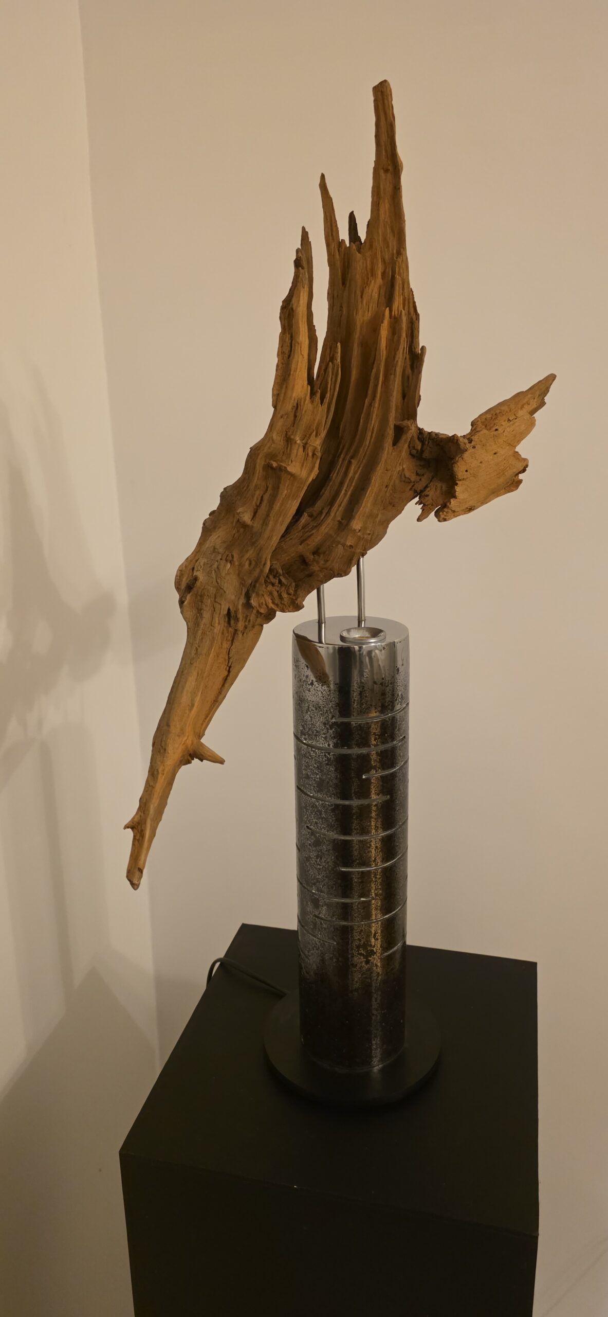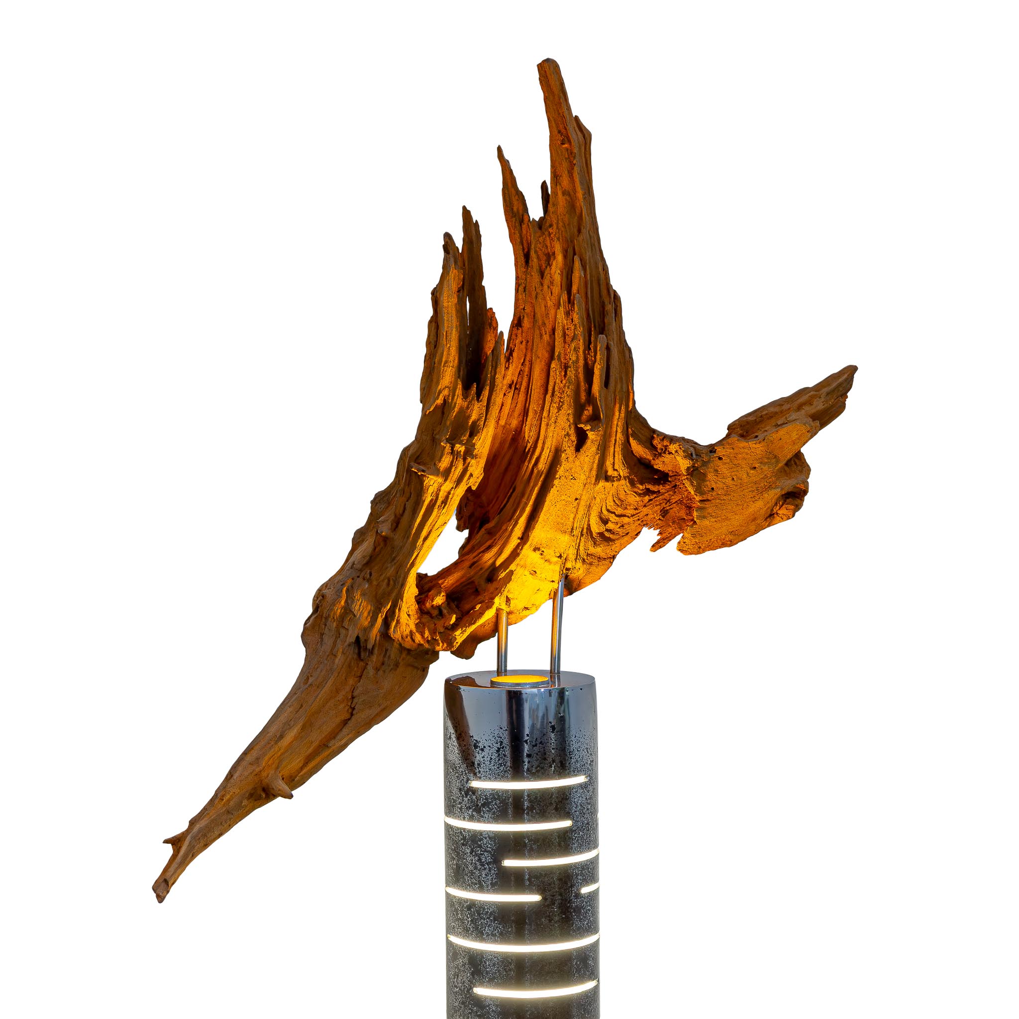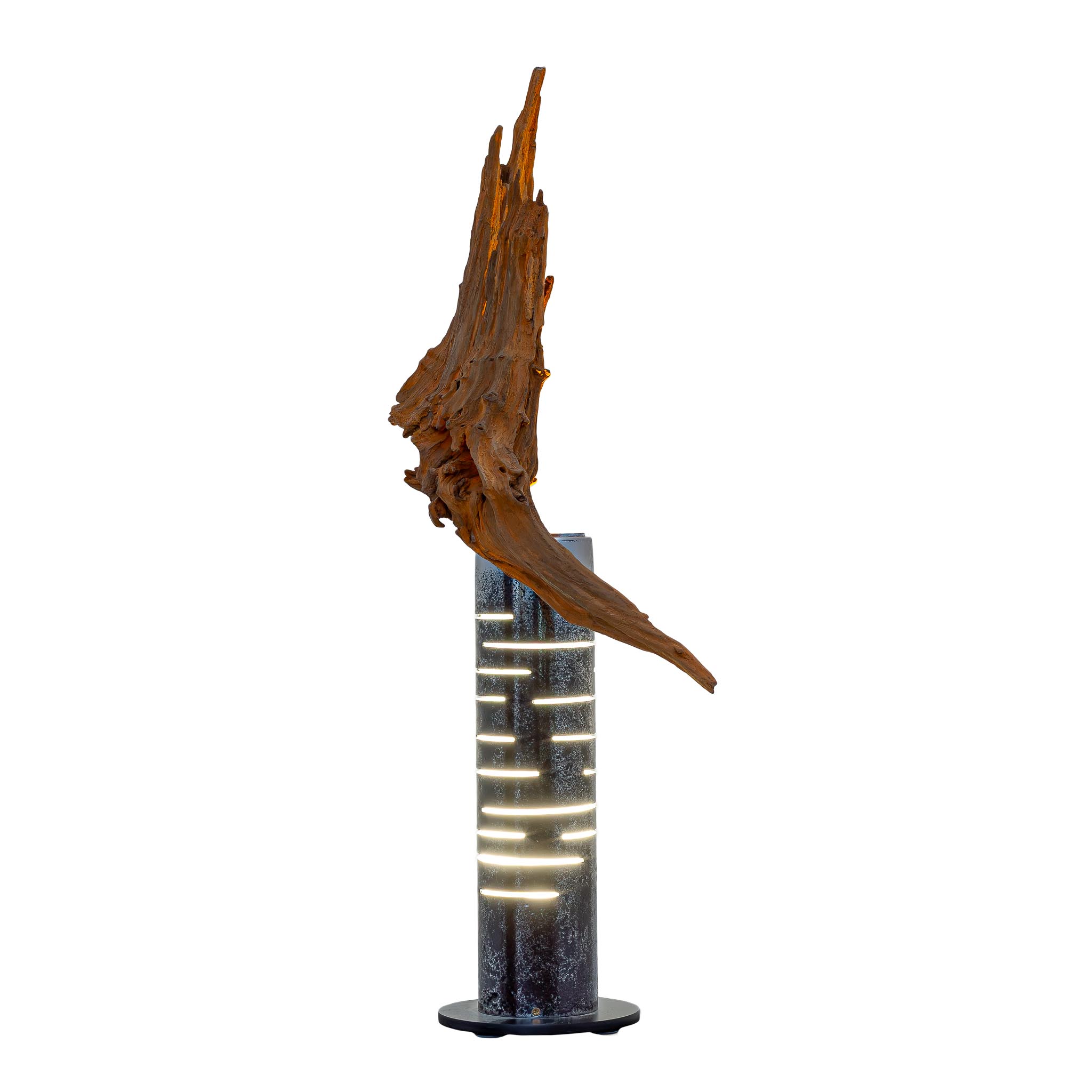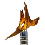 Šis šviestuvas – tarsi sustabdyta miško akimirka, kurioje susitinka žemė ir ugnis. Iš pušies šaknies gimusi forma kyla į viršų lyg laukinis, vėjo nugairintas gestas – netaisyklinga, gyva, kupina laiko žymių. Medienos paviršiuje šviesa atidengia metines rieves, plyšius ir randus, pasakojančius tylų, bet atkaklų augimo pasakojimą.