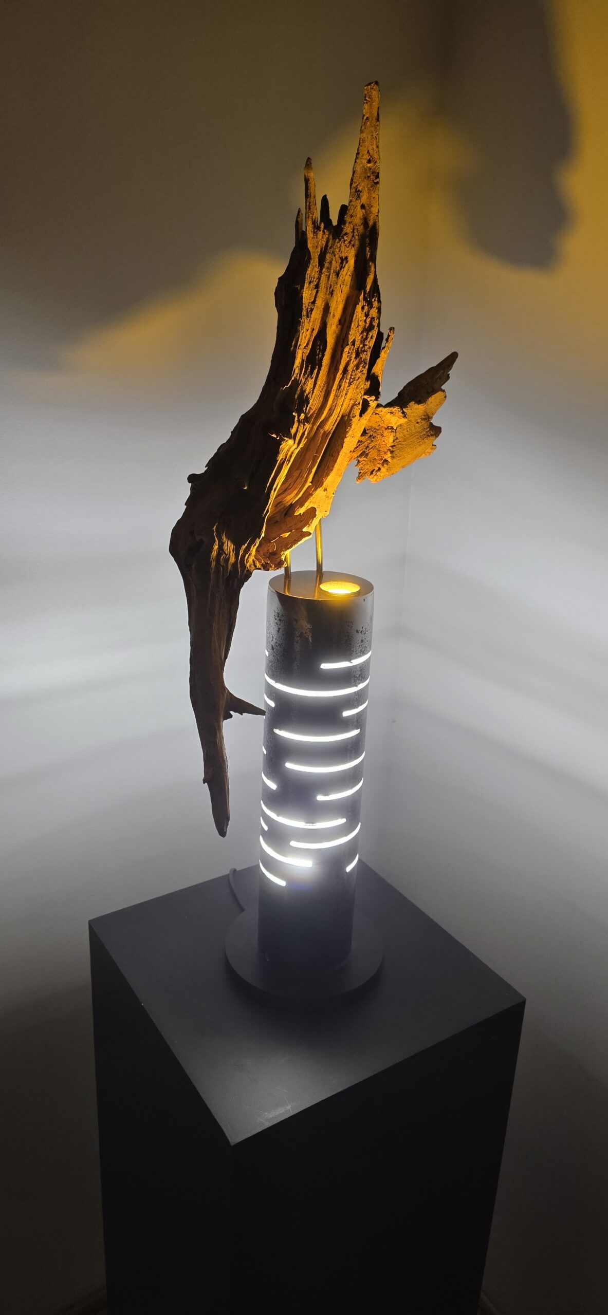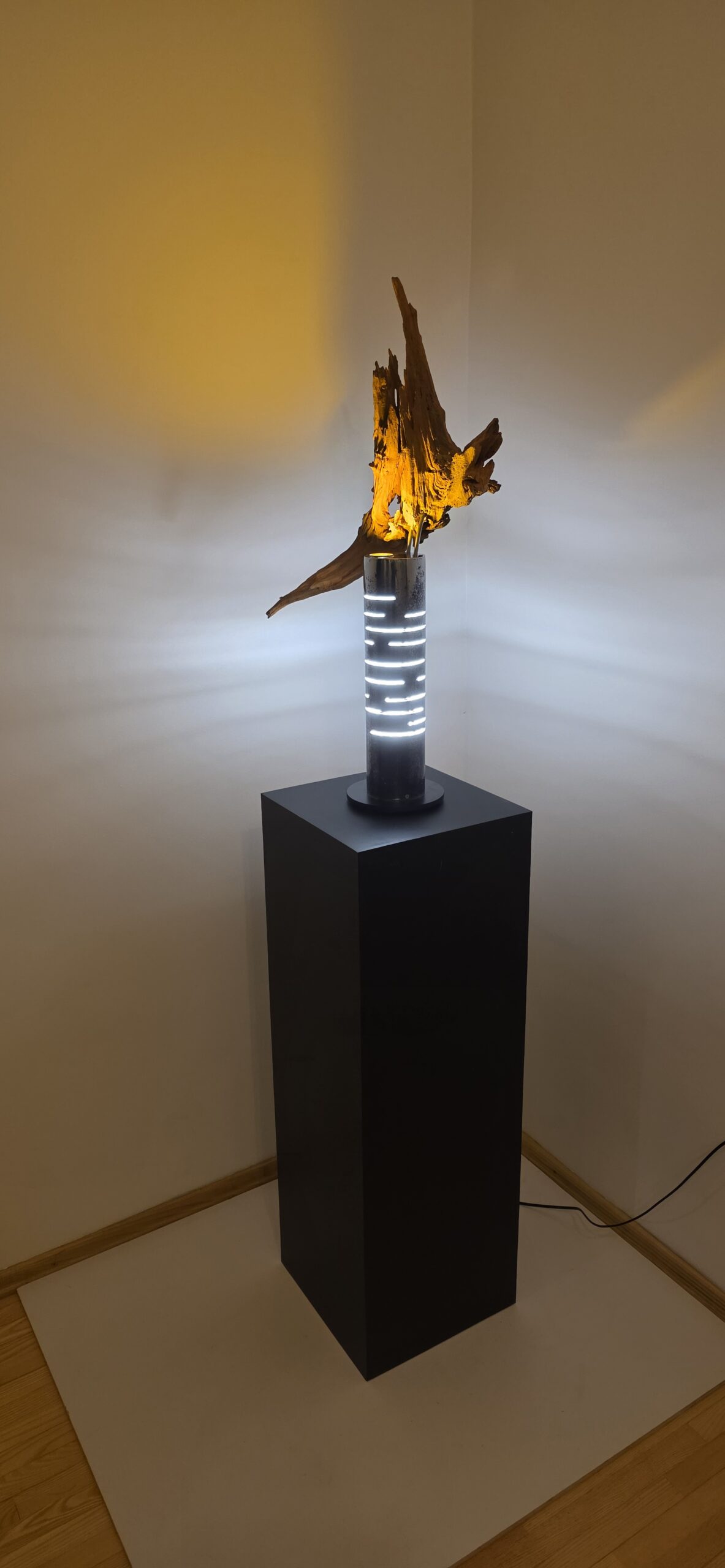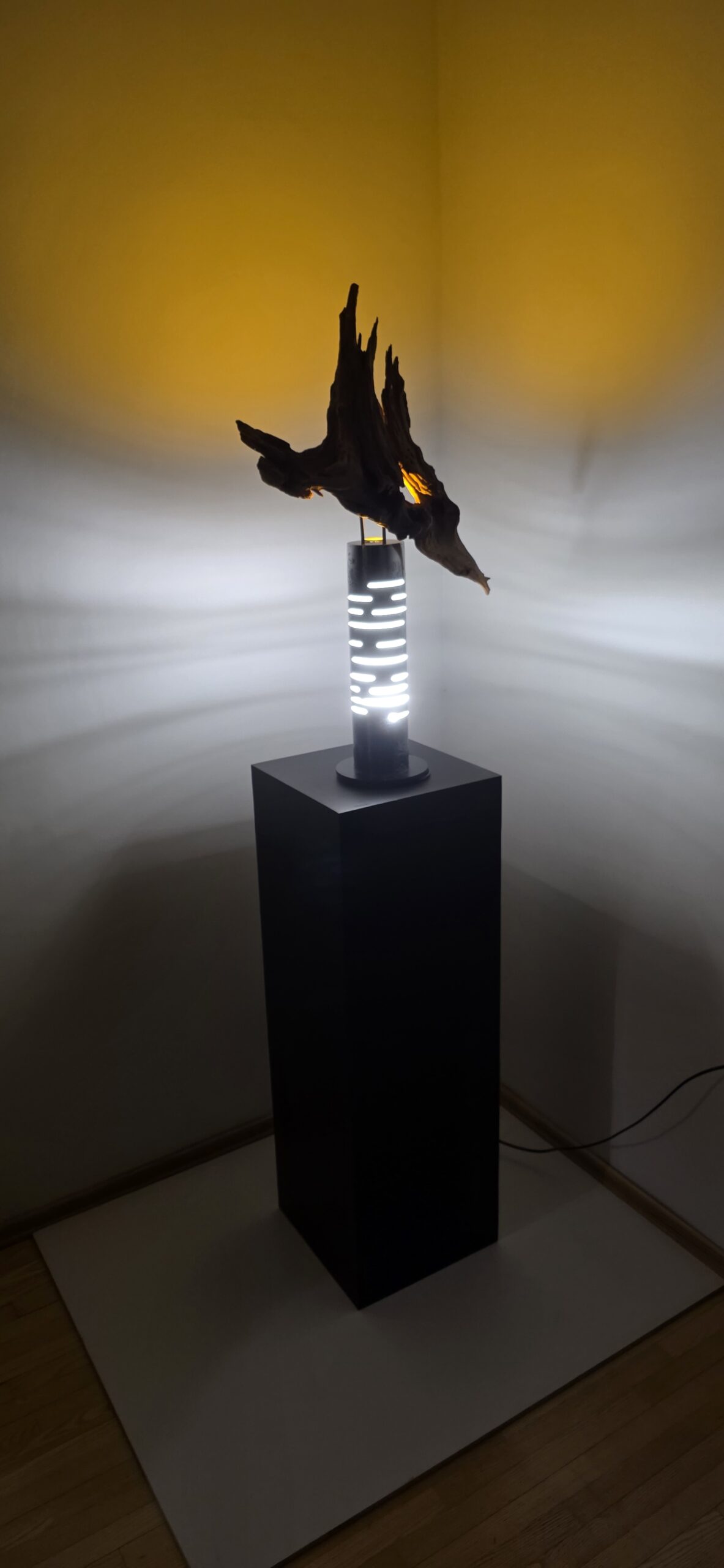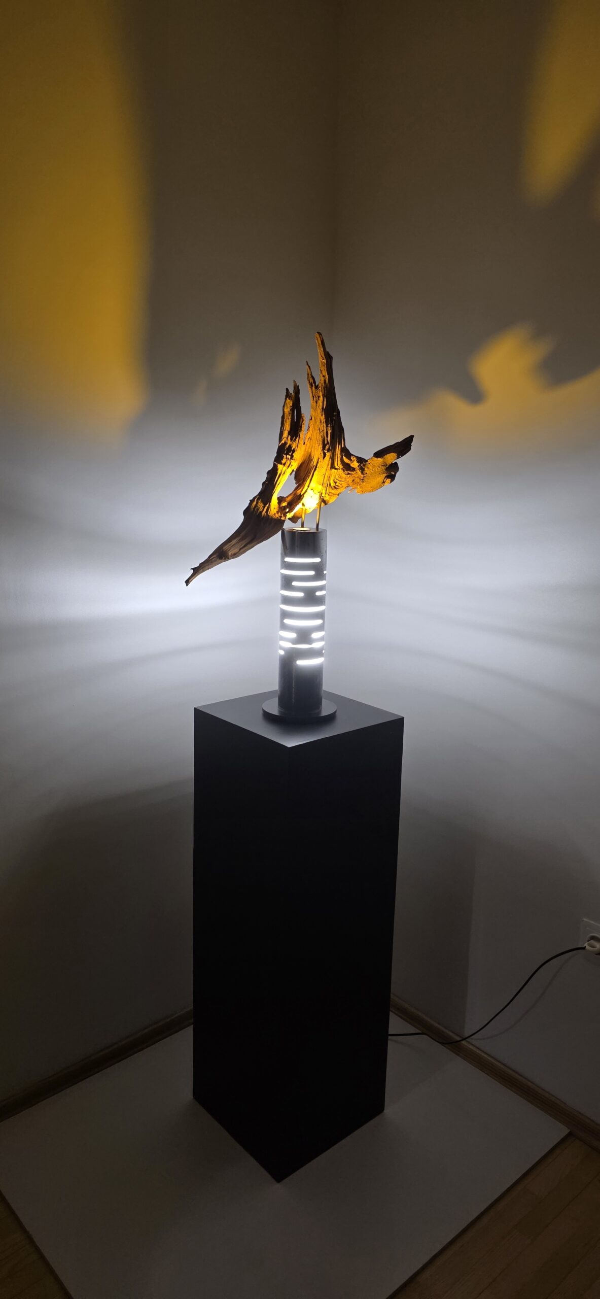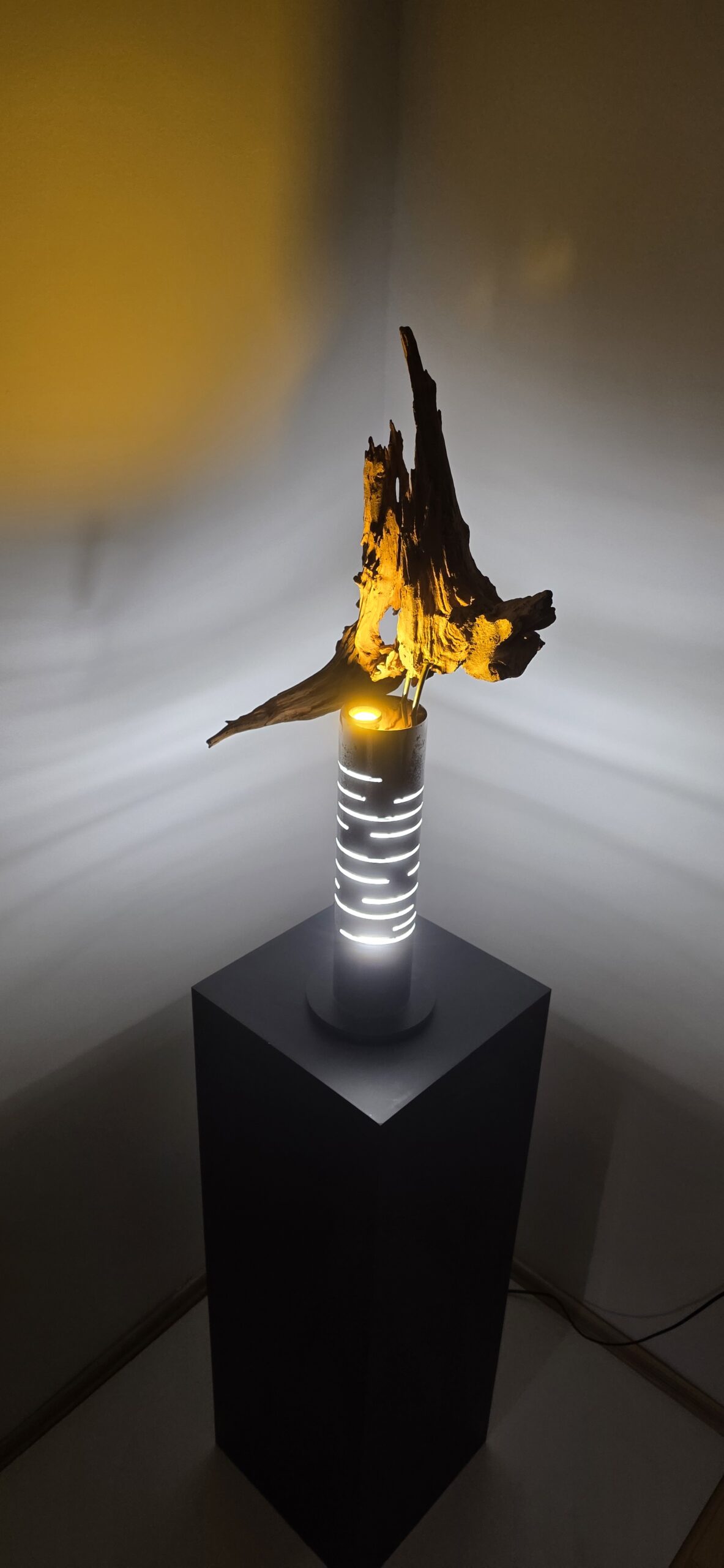 Apačioje – griežtas, industrinis 90 mm metalinis vamzdis. Jo išpjautos skylės ritmingai laužo šviesą, paversdamos ją pulsavimu, kvėpavimu. Šaltas metalas čia tampa scenos rėmu, iš kurio veržiasi šiltas, gintarinis spindesys, apglėbiantis šaknį iš vidaus.