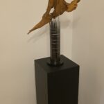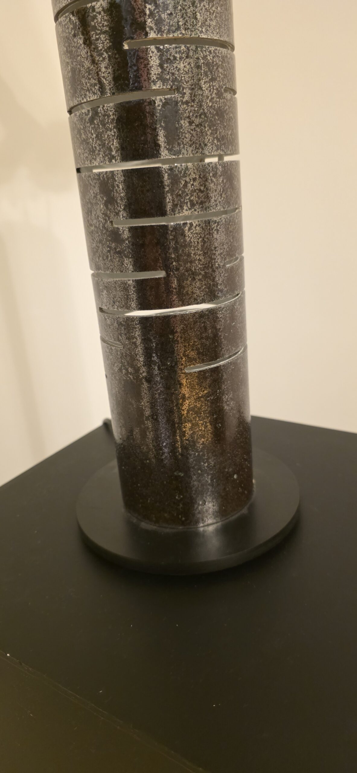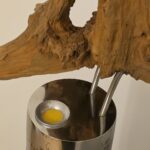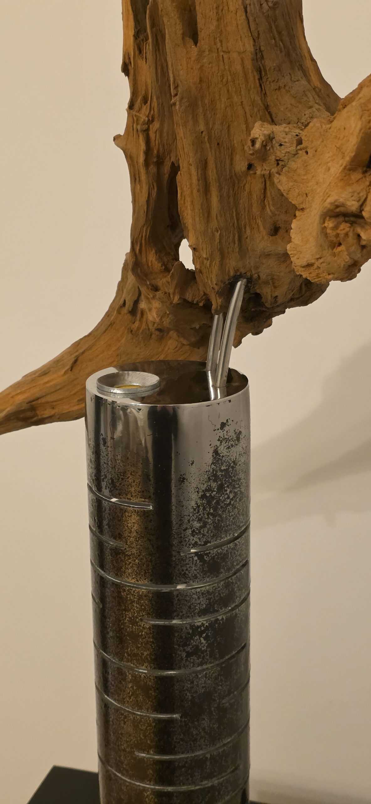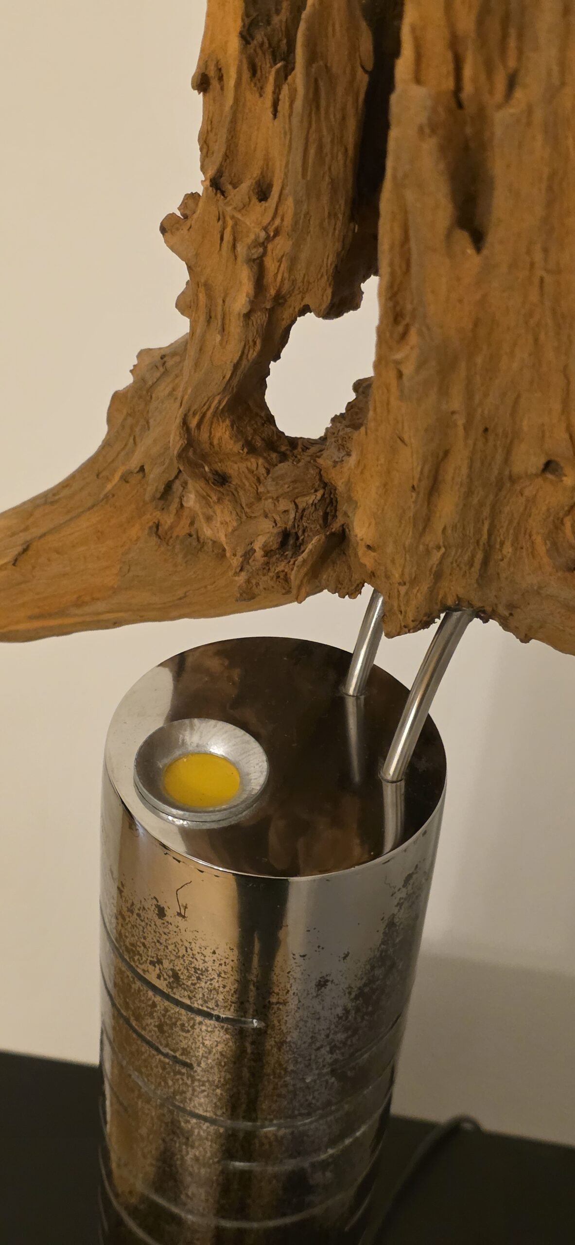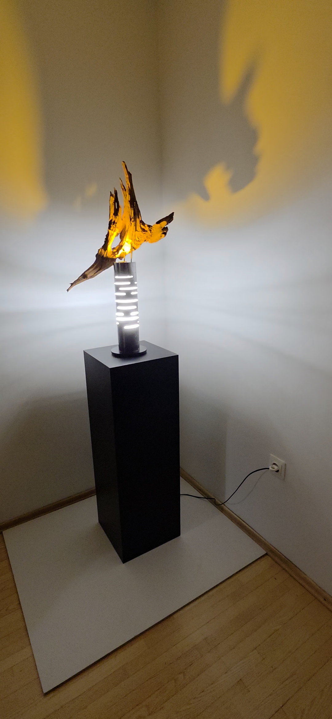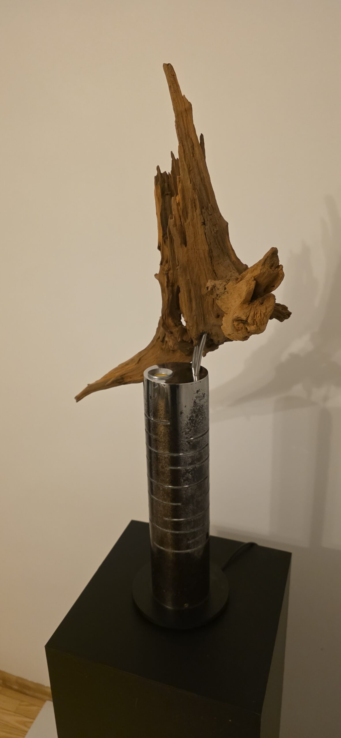 Apačioje – griežtas, industrinis 90 mm metalinis vamzdis. Jo išpjautos skylės ritmingai laužo šviesą, paversdamos ją pulsavimu, kvėpavimu. Šaltas metalas čia tampa scenos rėmu, iš kurio veržiasi šiltas, gintarinis spindesys, apglėbiantis šaknį iš vidaus.