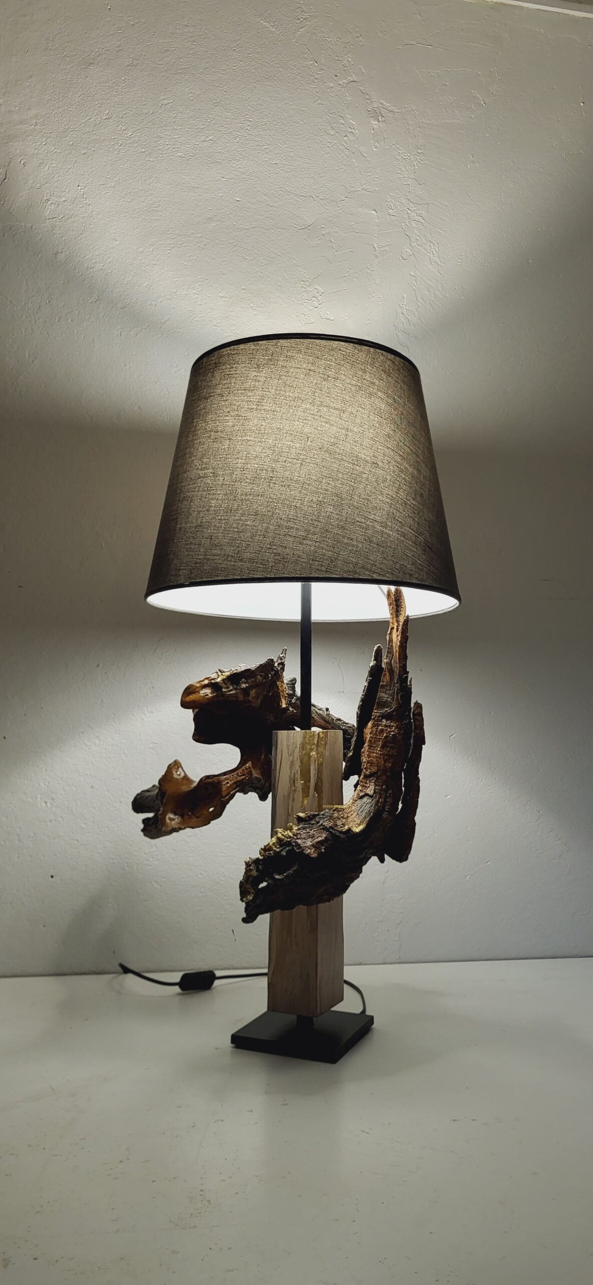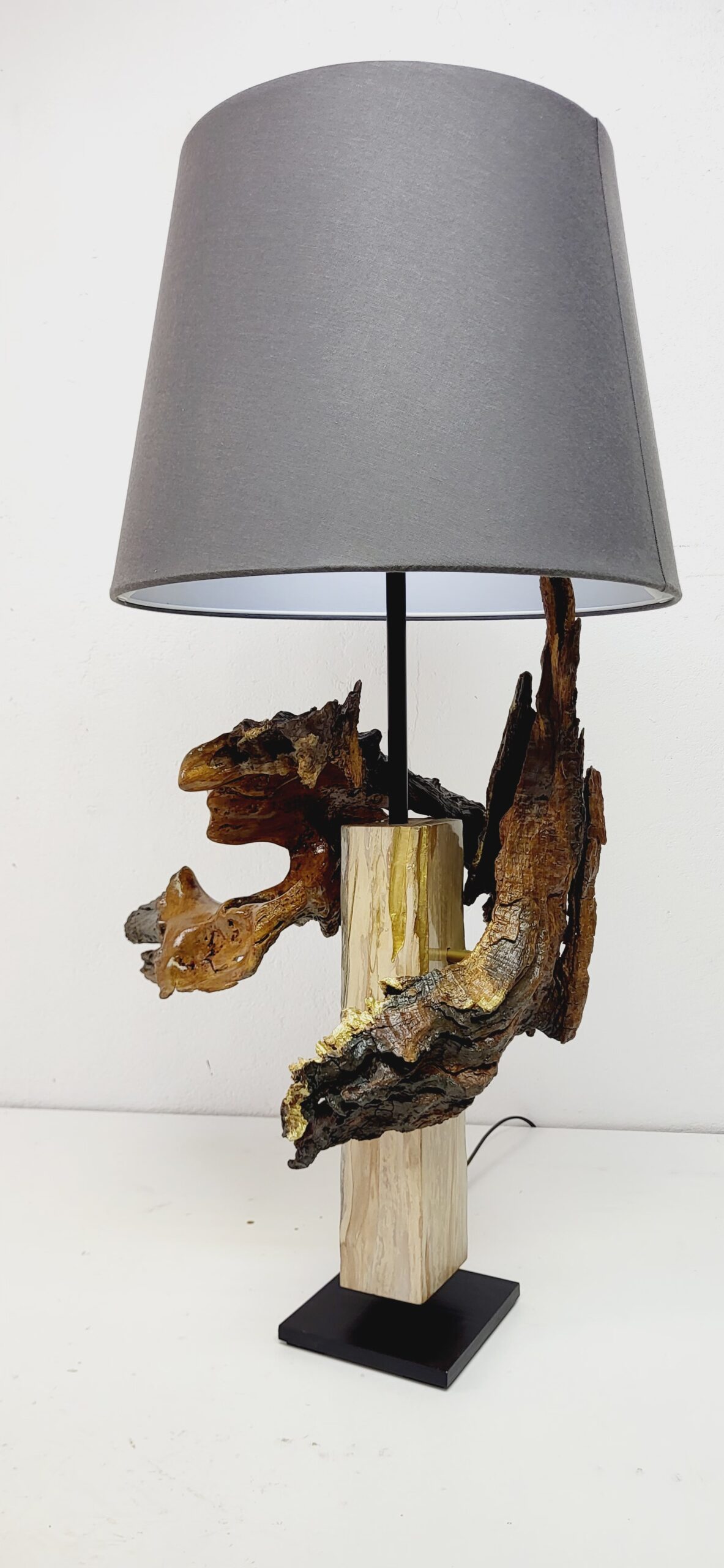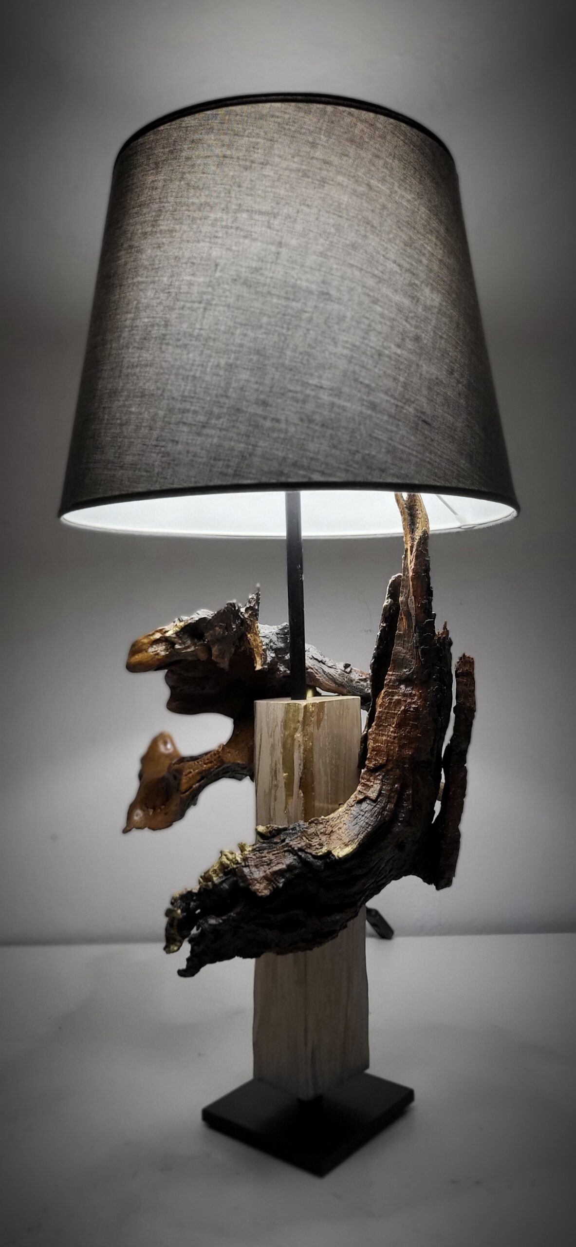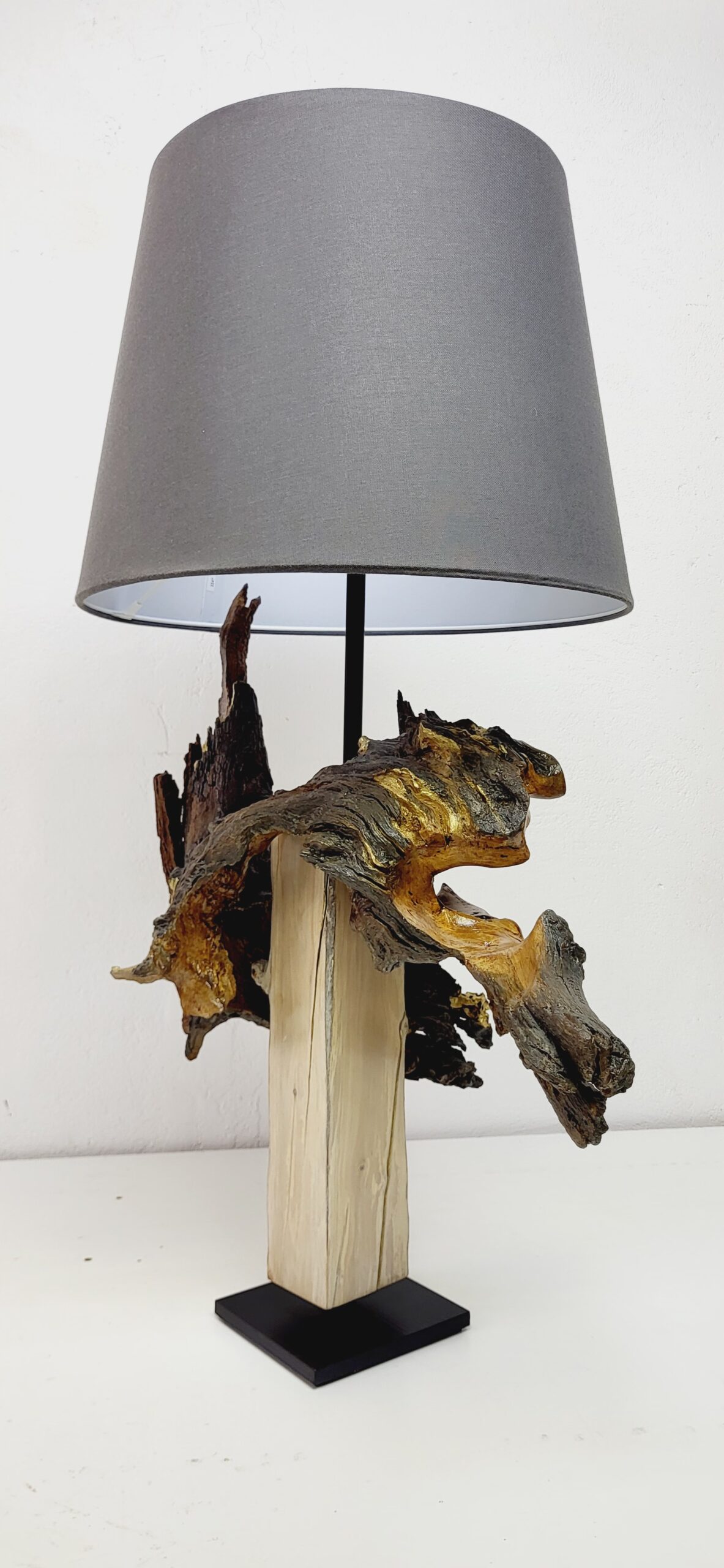 Lempos dekoratyvinė dalis iš pušies šaknies. Postamentas pagamintas iš ąžuolo