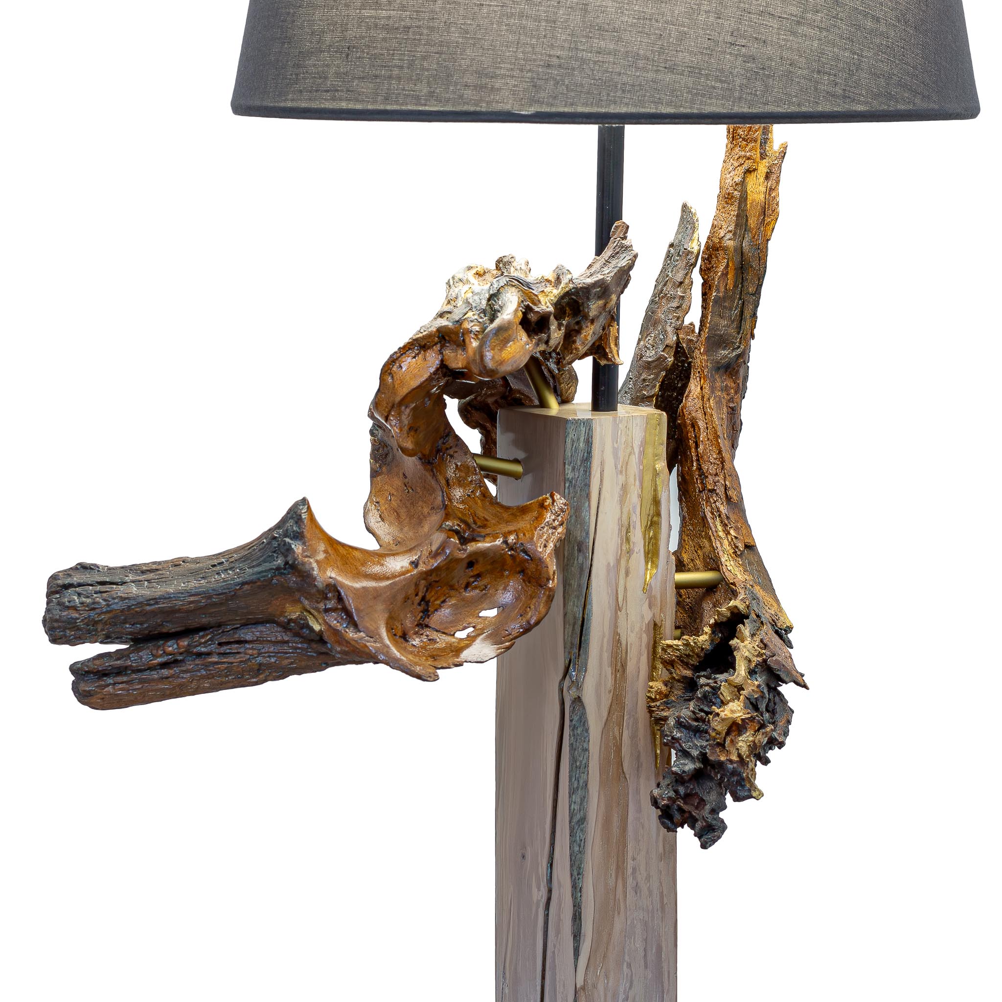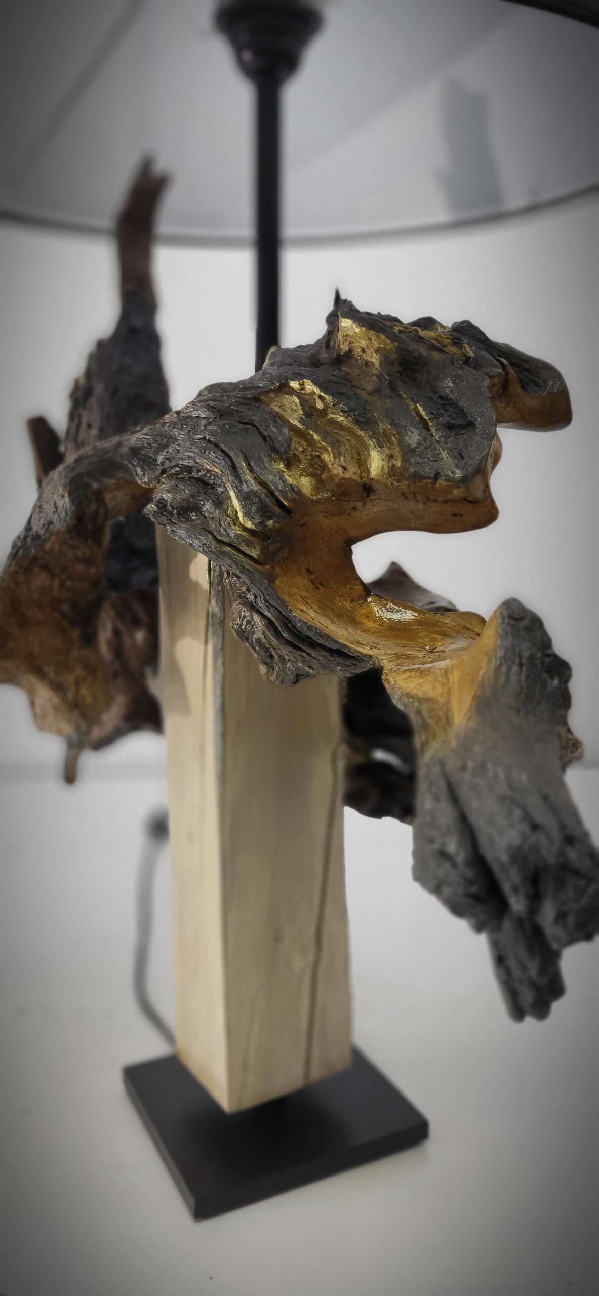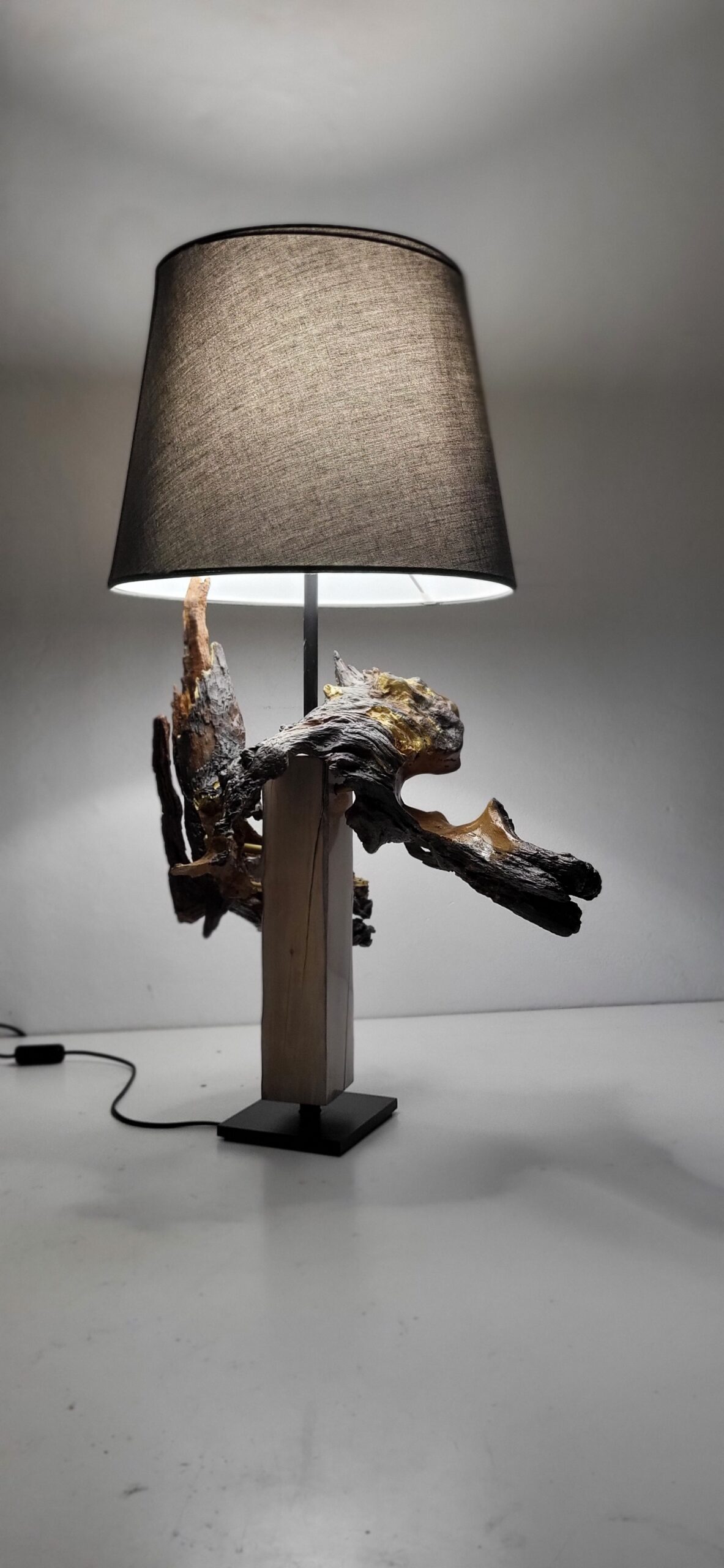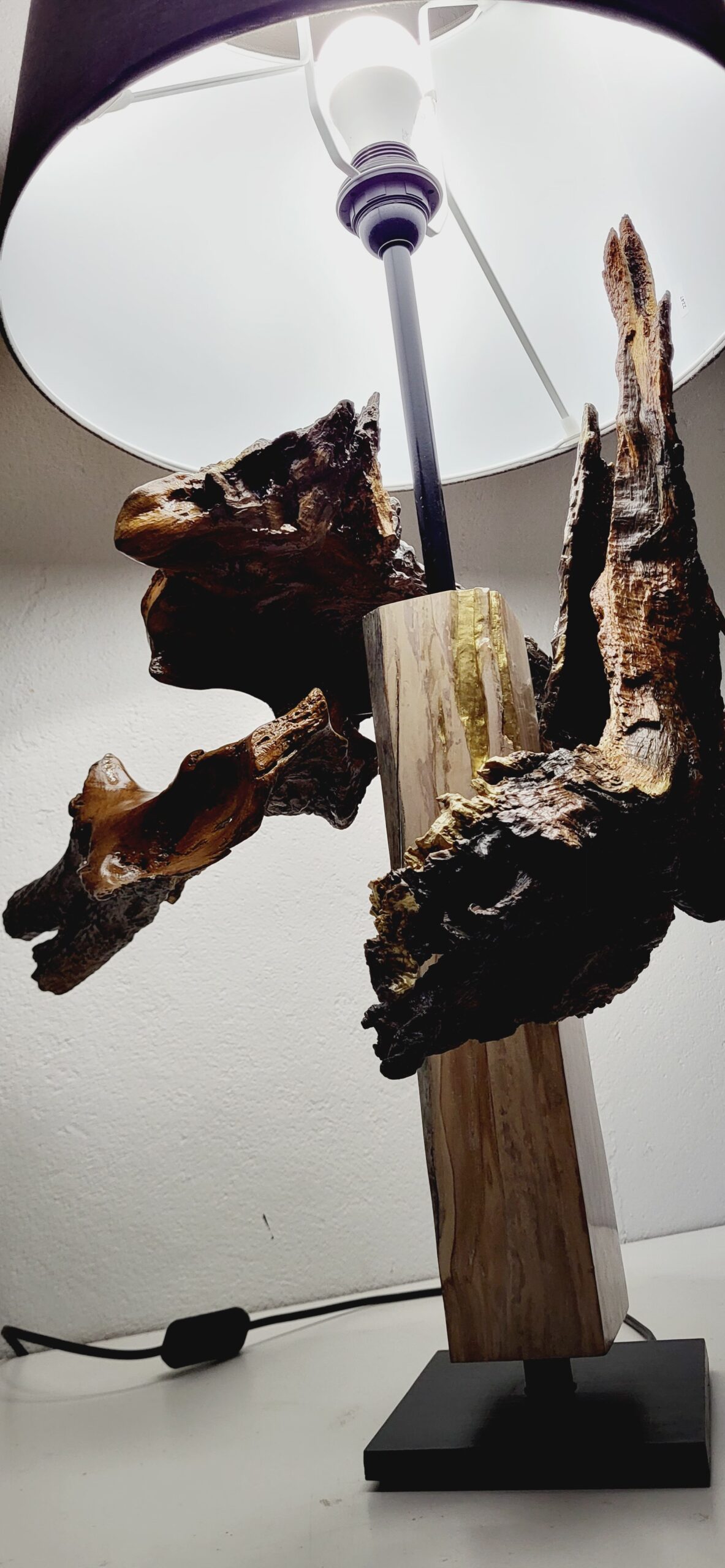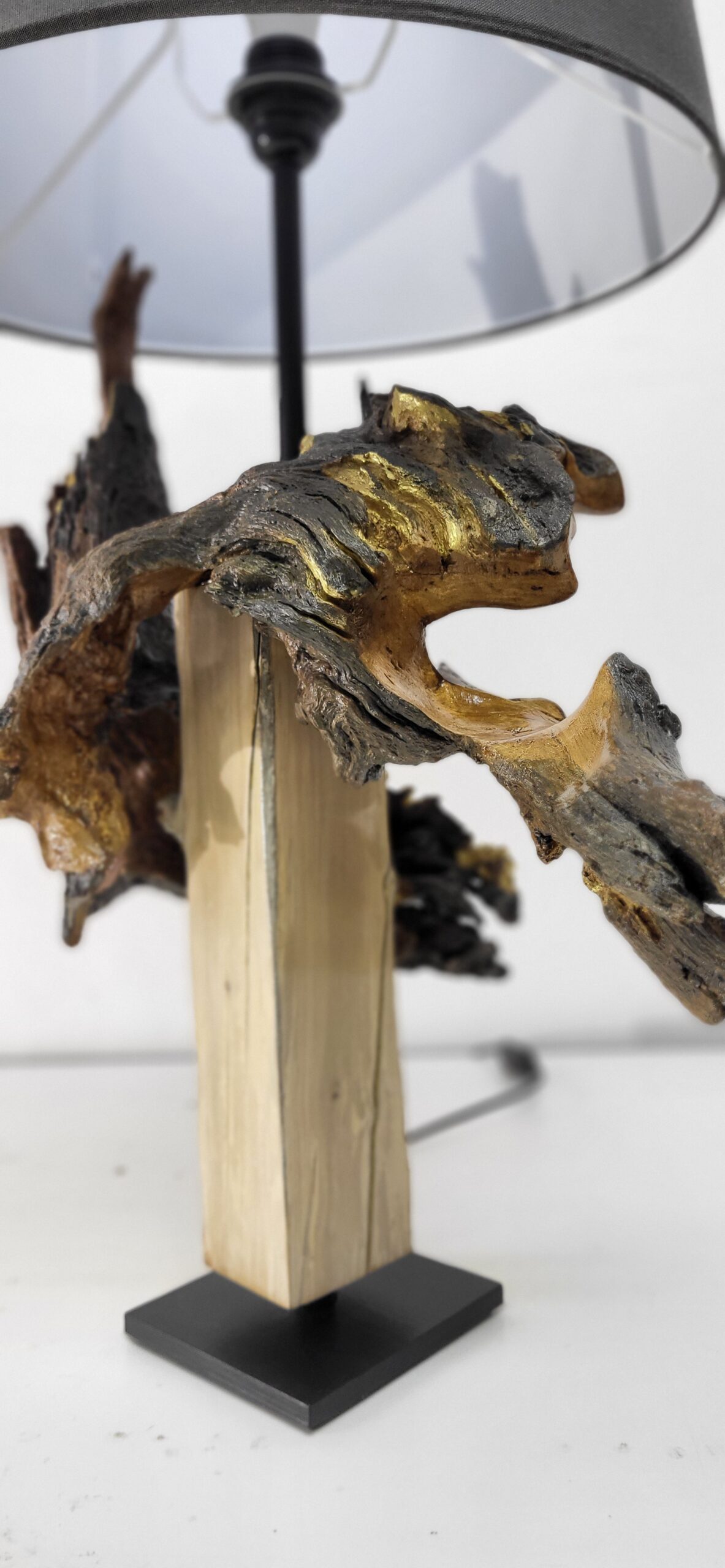 Lempos dekoratyvinė dalis iš pušies šaknies. Postamentas pagamintas iš ąžuolo
