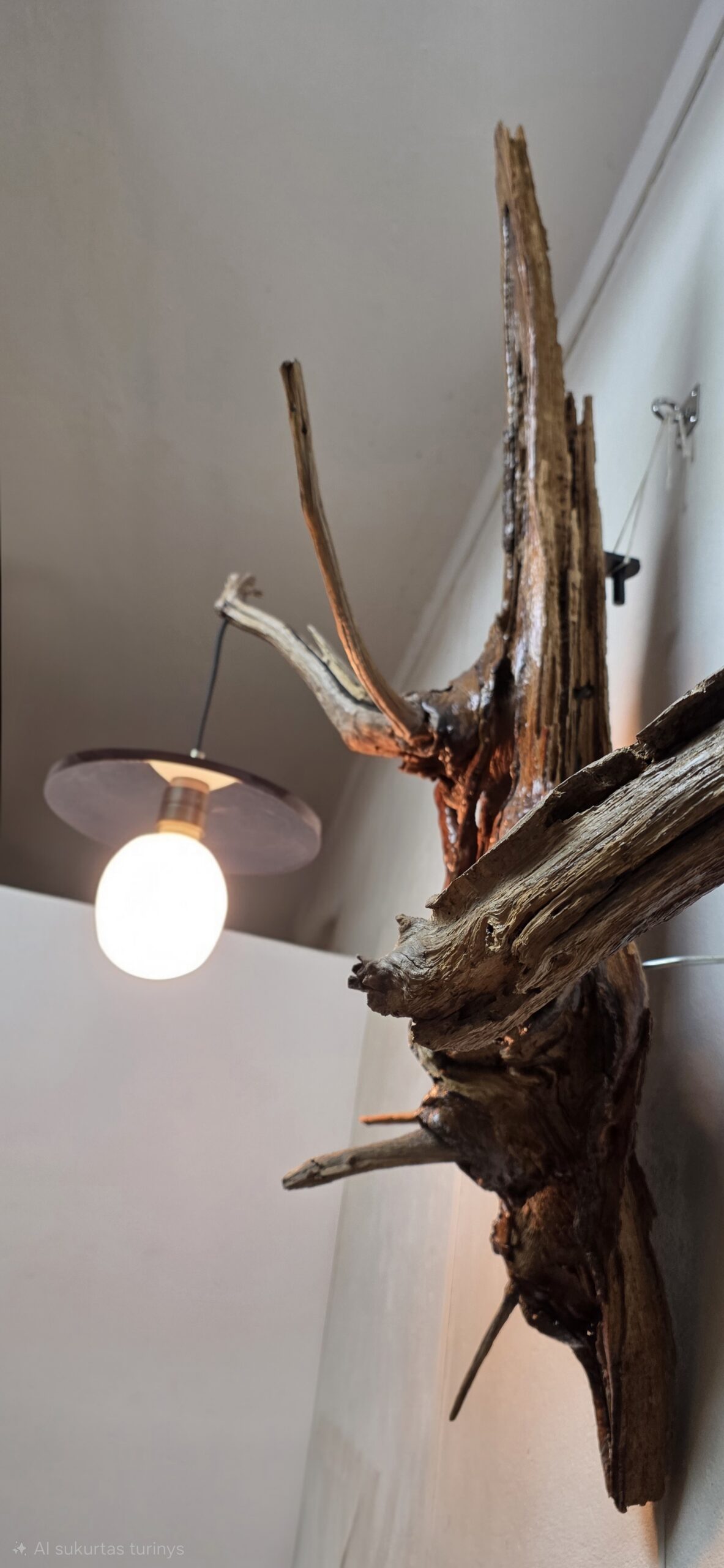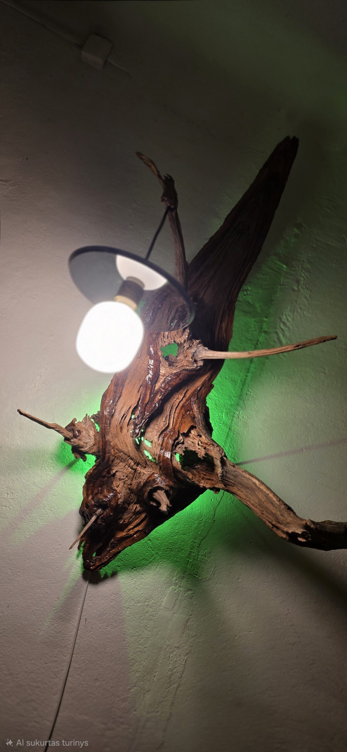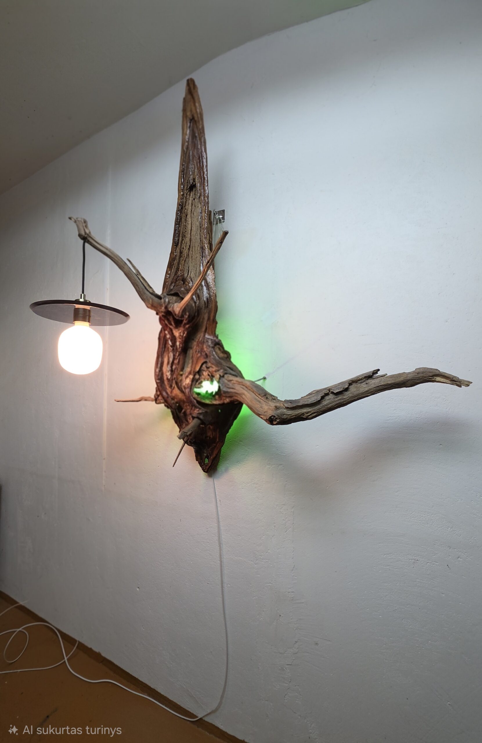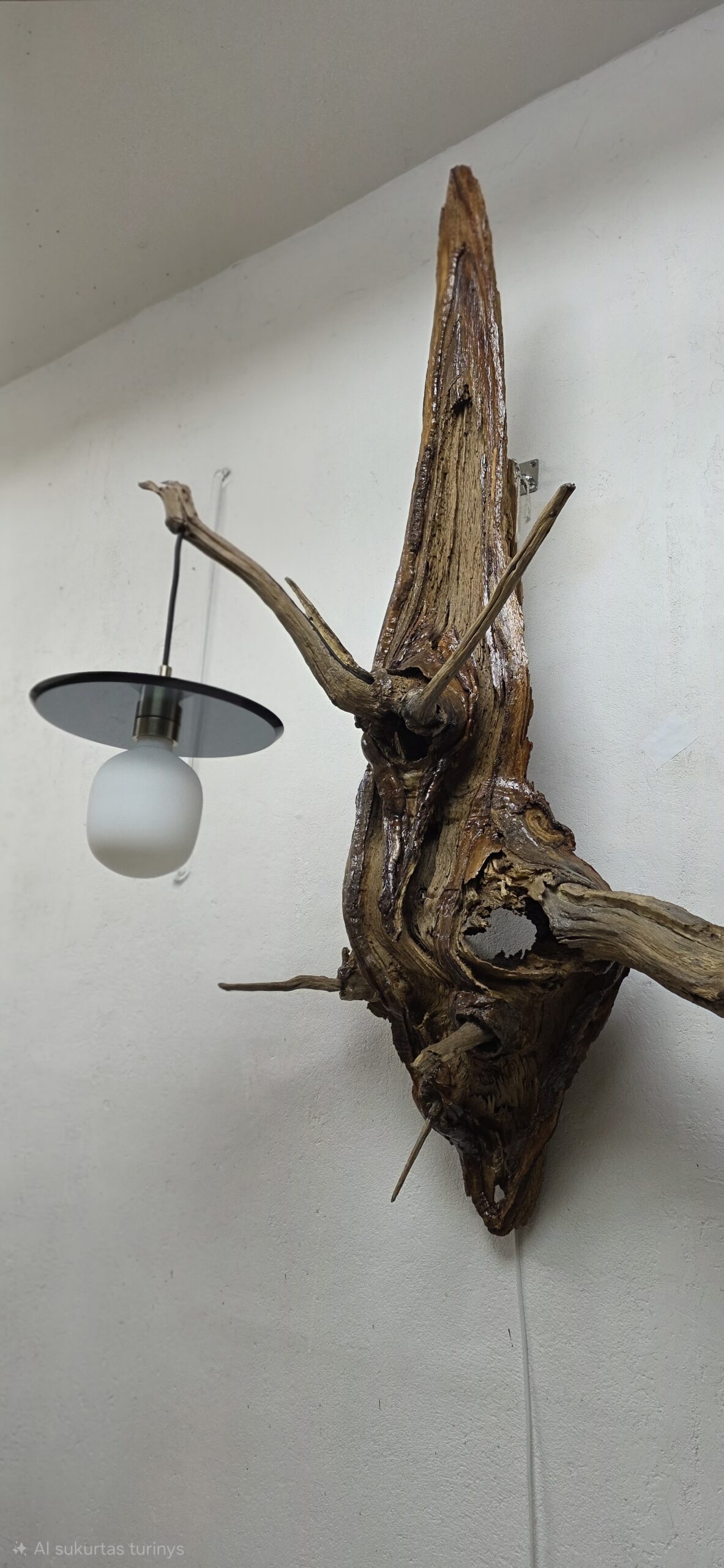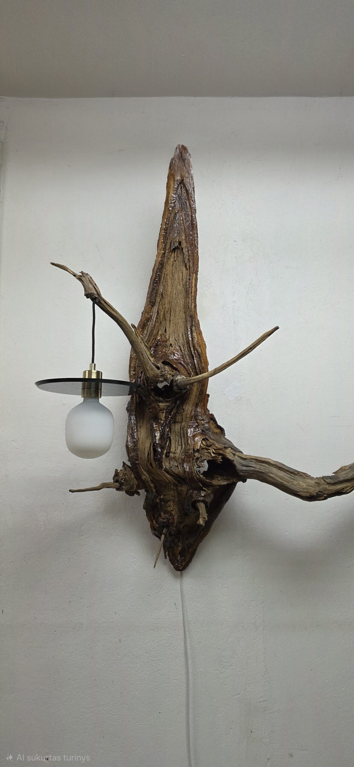 Gamtos įkvėptas interjero akcentas – sieninis šviestuvas, sukurtas iš vientiso natūralaus ąžuolo gabalo. Laiko ir oro suformuoti kontūrai bei organiška medžio tekstūra atsiskleidžia šviesai slystant paviršiumi, išryškindami kiekvieną įtrūkimą, šaką ir natūralią liniją.