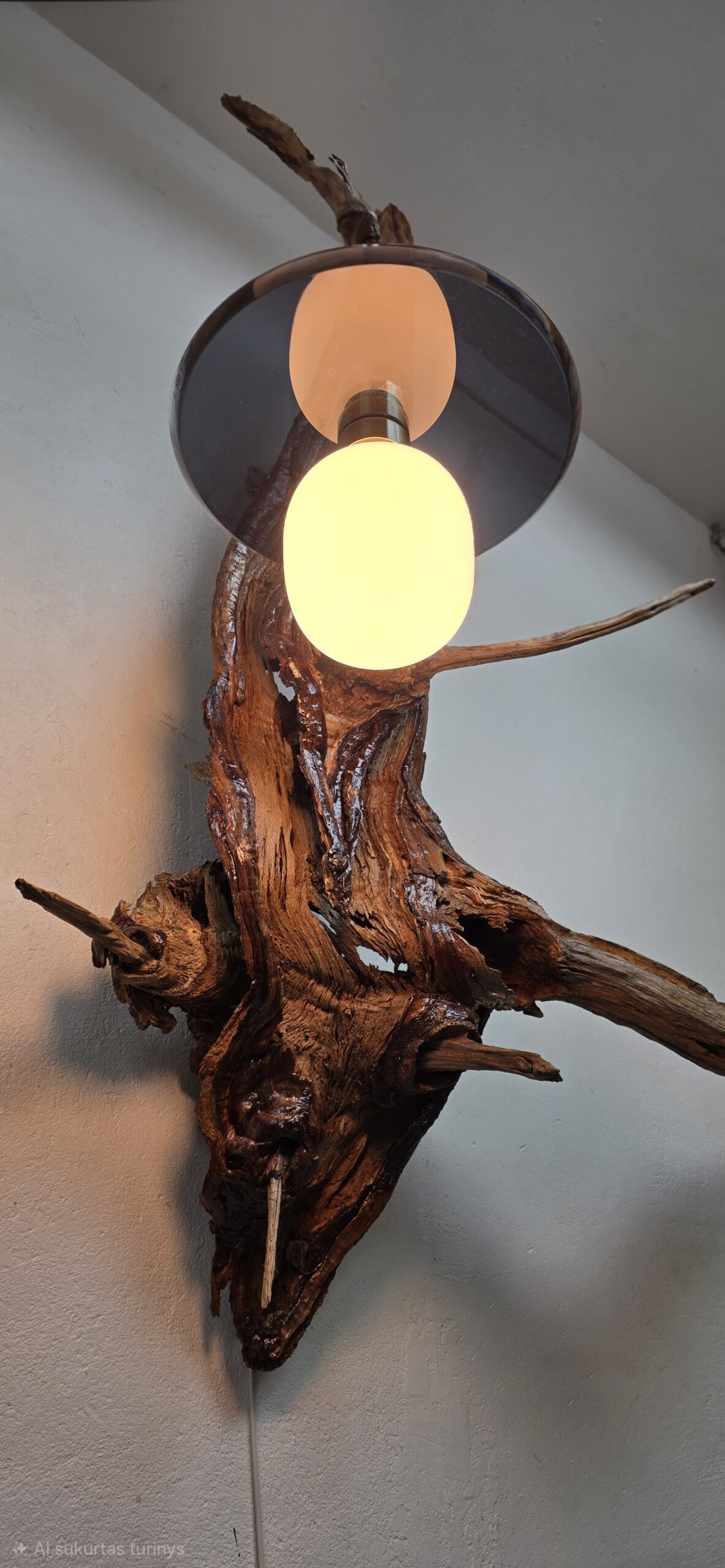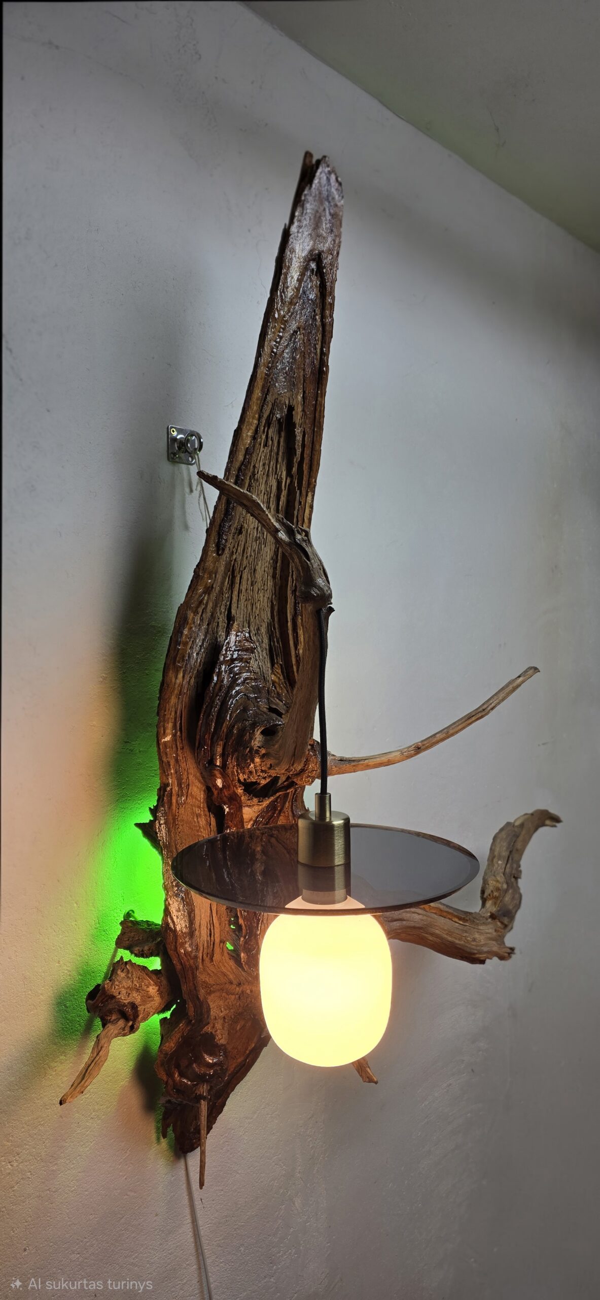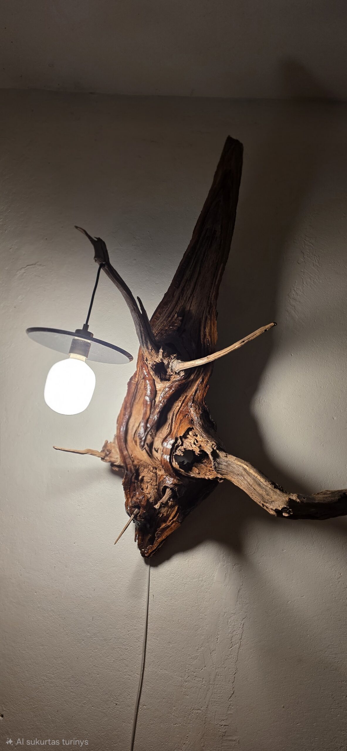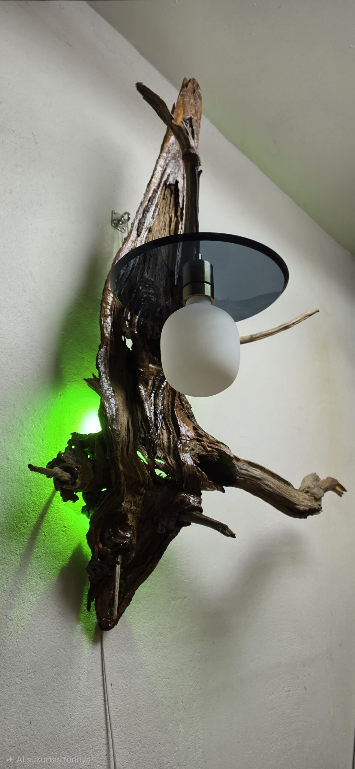 Gamtos įkvėptas interjero akcentas – sieninis šviestuvas, sukurtas iš vientiso natūralaus ąžuolo gabalo. Laiko ir oro suformuoti kontūrai bei organiška medžio tekstūra atsiskleidžia šviesai slystant paviršiumi, išryškindami kiekvieną įtrūkimą, šaką ir natūralią liniją.