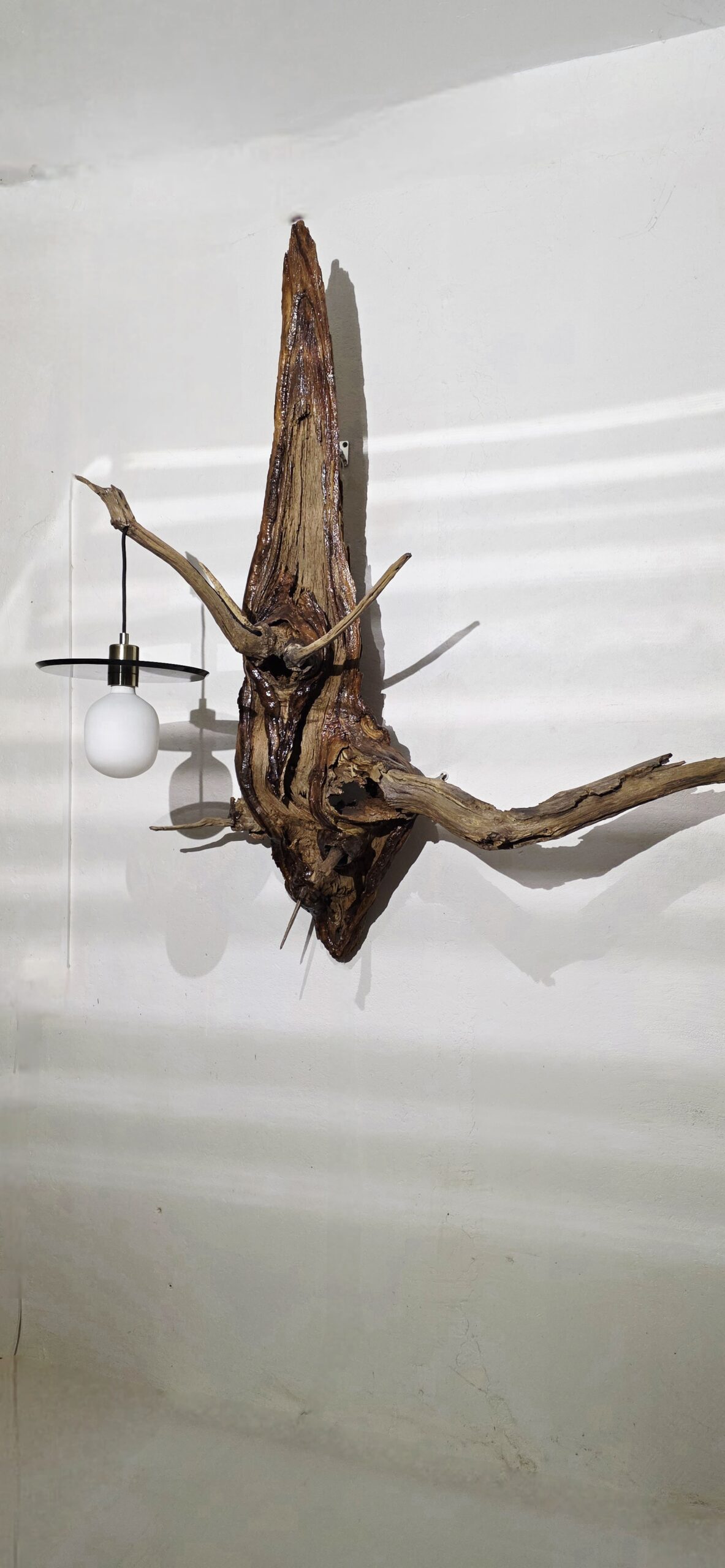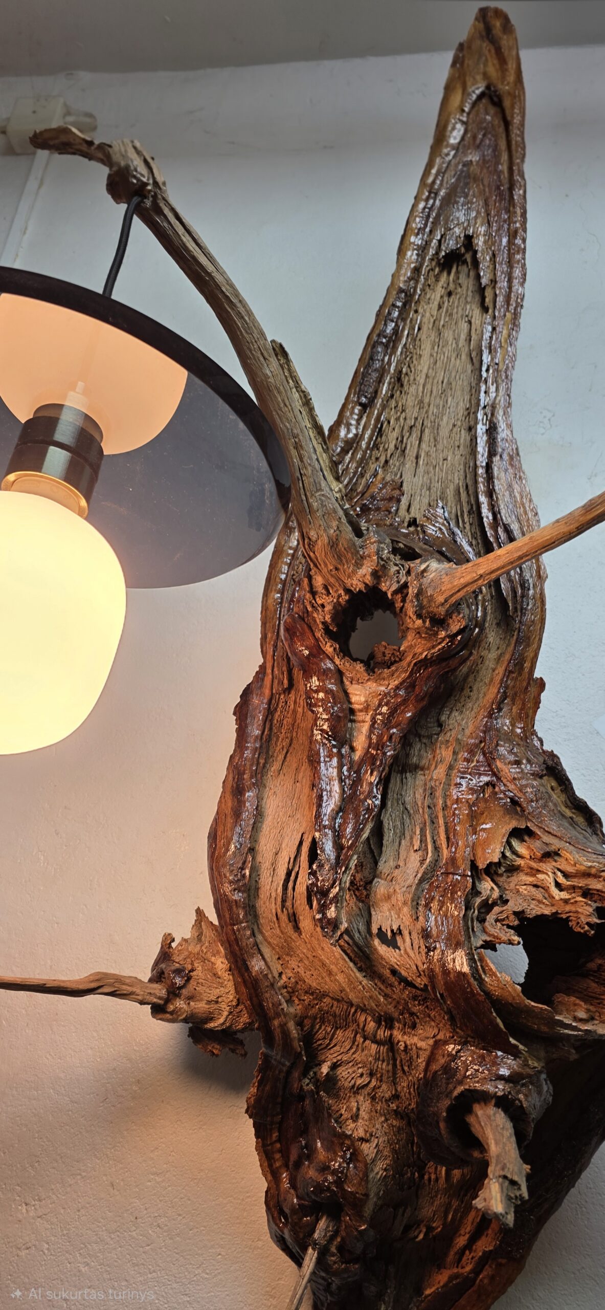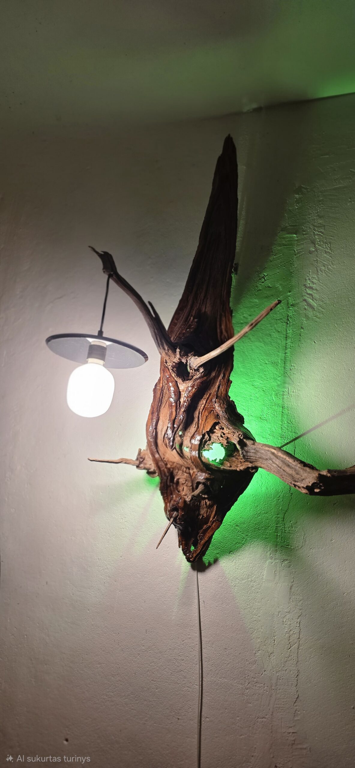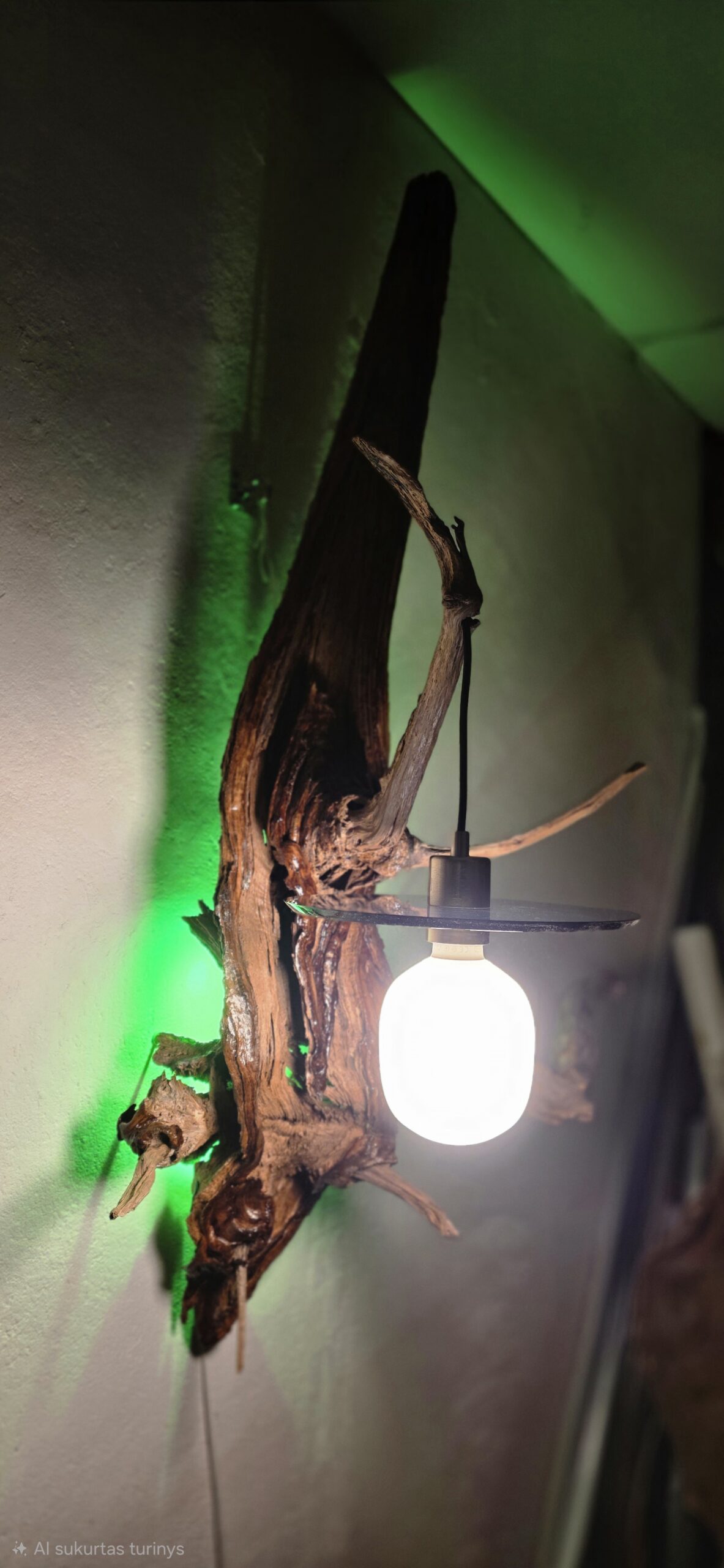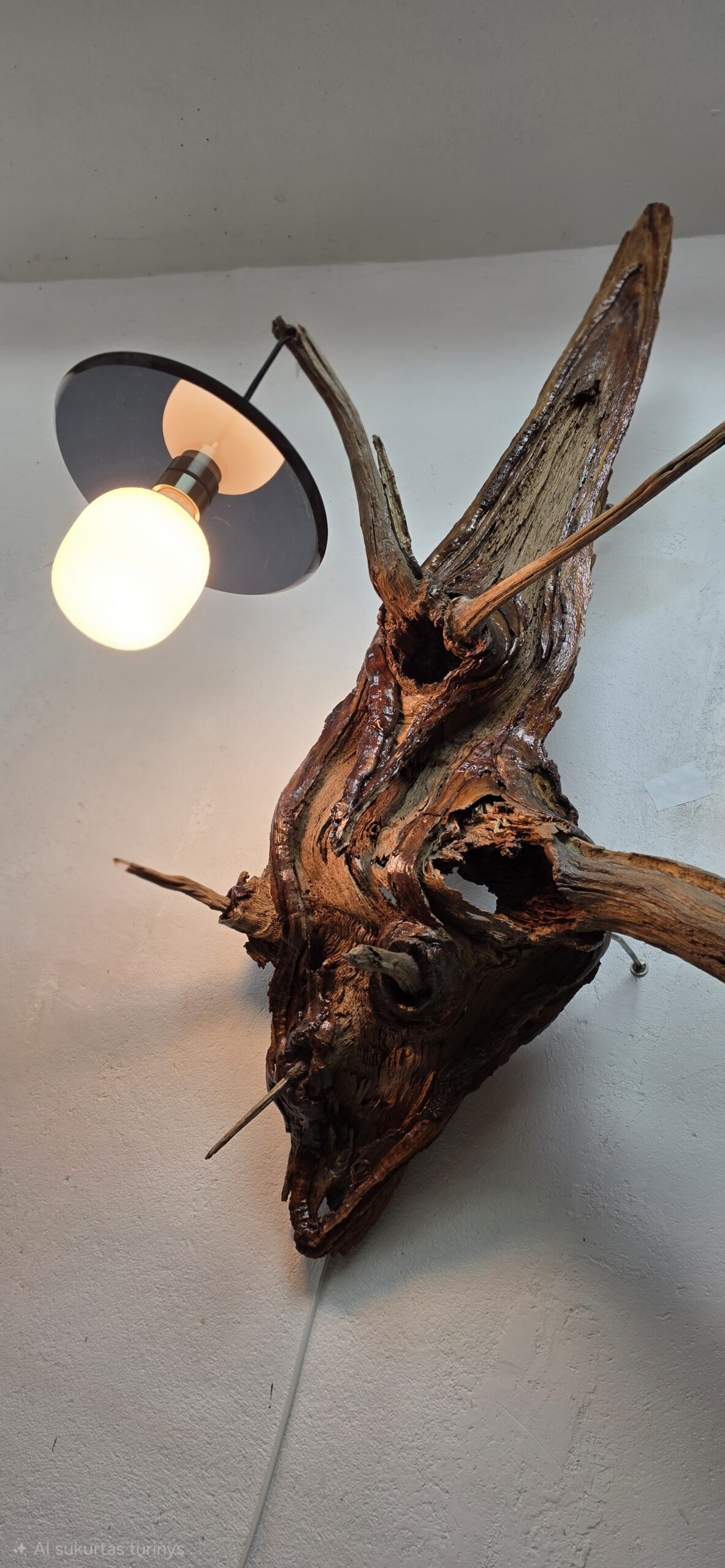 Gamtos įkvėptas interjero akcentas – sieninis šviestuvas, sukurtas iš vientiso natūralaus ąžuolo gabalo. Laiko ir oro suformuoti kontūrai bei organiška medžio tekstūra atsiskleidžia šviesai slystant paviršiumi, išryškindami kiekvieną įtrūkimą, šaką ir natūralią liniją.