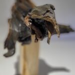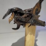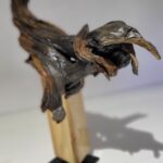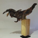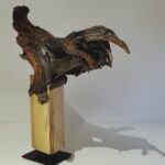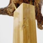 Skulptūrai panaudota nulakuota pušies šaknis. Postamentas padarytas iš lakuoto ir
